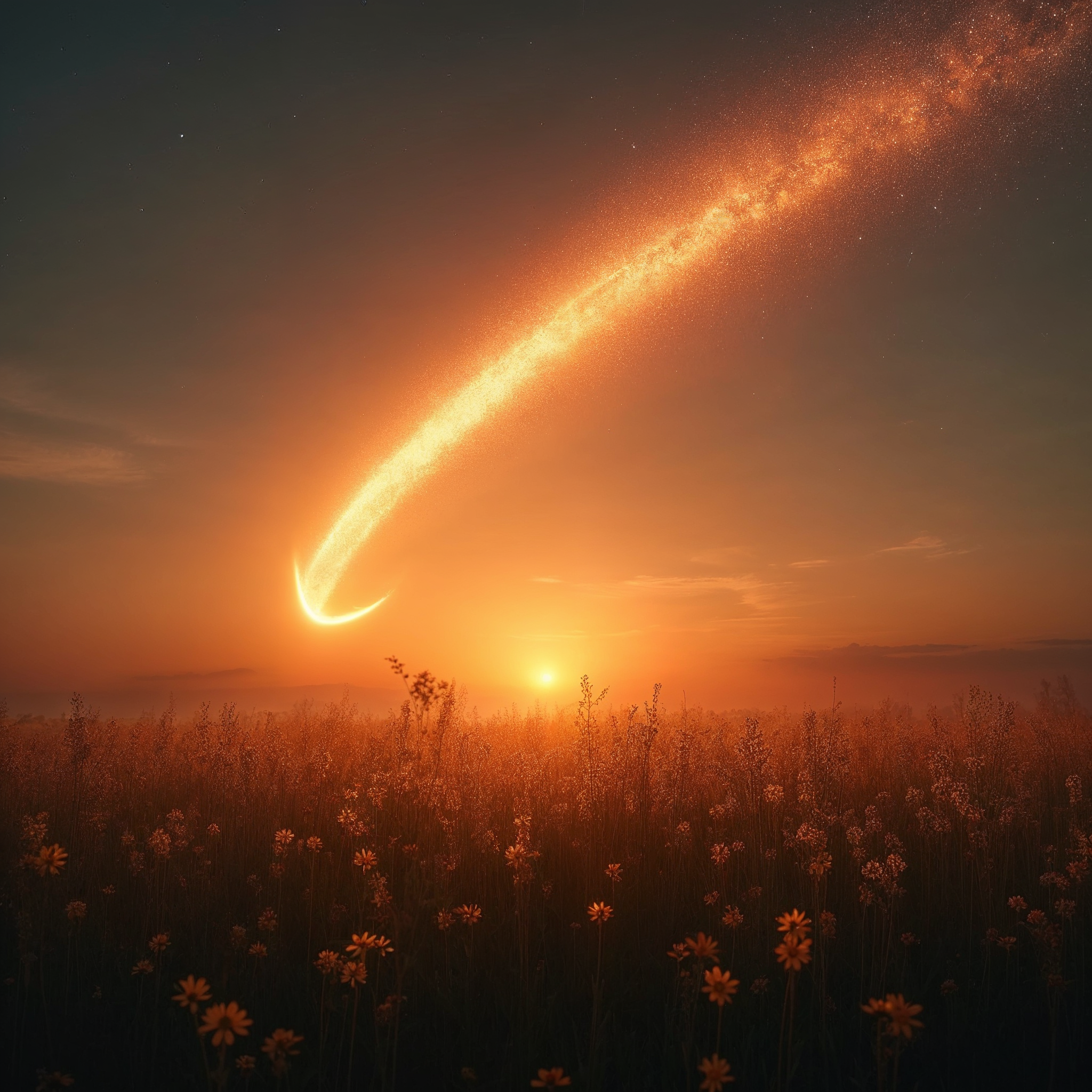 astronomy, celestial, clouds, comet, cosmic, field, flowers, glowing trail, golden hour, grass, horizon, landscape, meteor, nature, night sky, orange sky, outdoor, scenery, sky, stars, streak, sunset, twilight, vibrant, shooting star