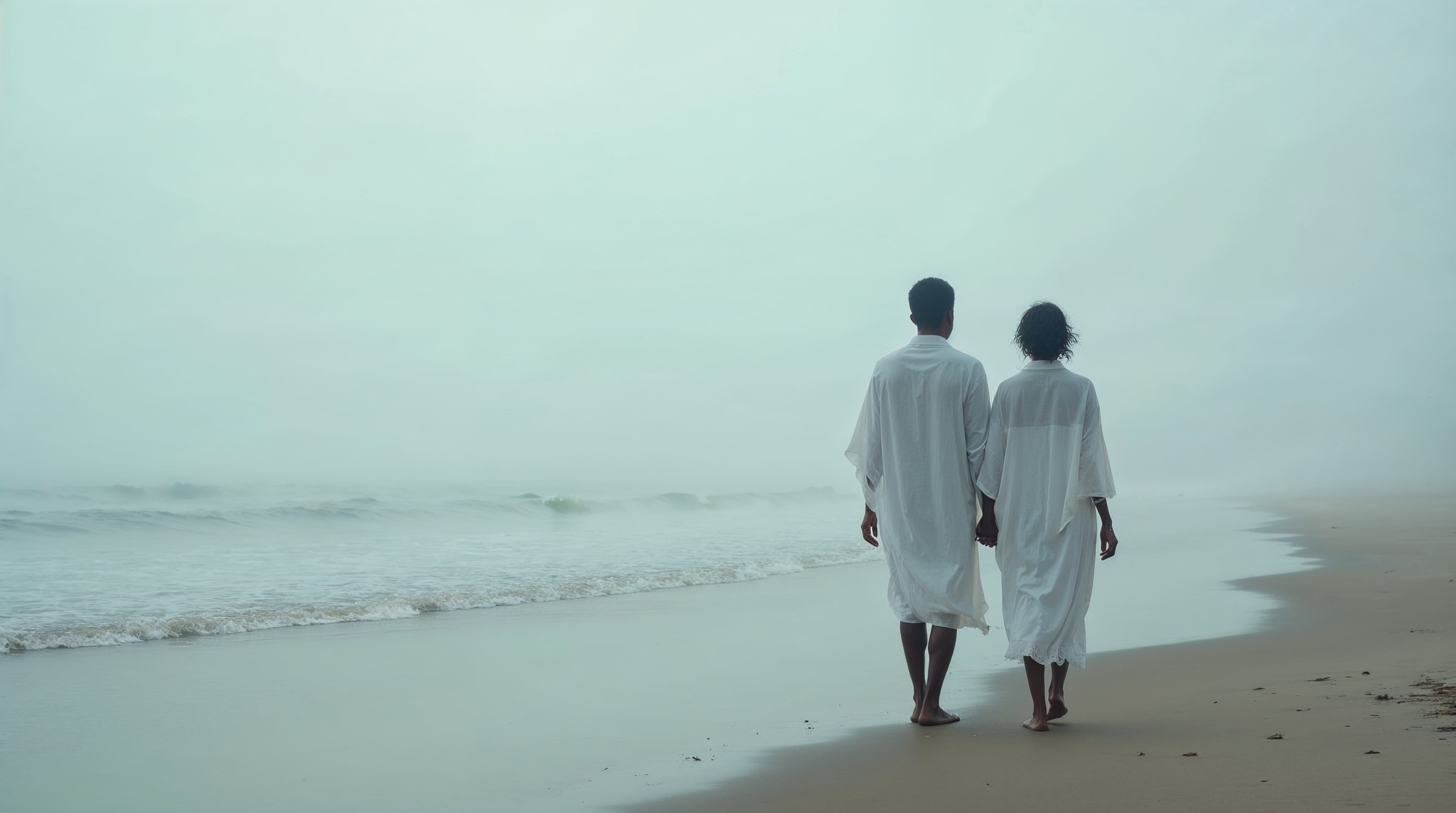 A man and woman in white flowing garments walk hand-in-hand along a sandy beach. Gentle waves lap at the shore in the background, enveloped in thick fog. They face away from the camera, barefoot on the wet sand.