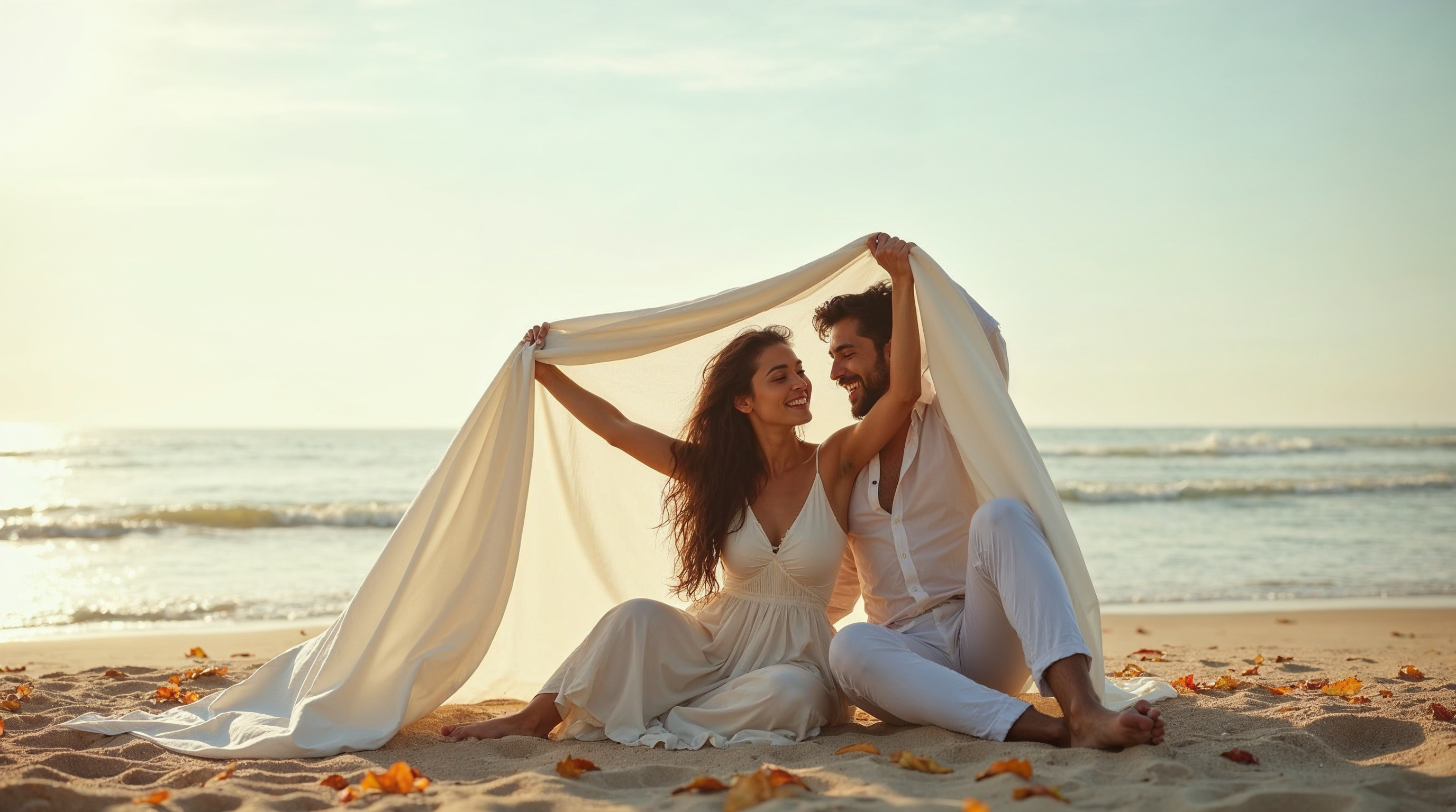 A smiling man and woman sit on the sandy beach at sunset, holding up a large white veil over their heads. The woman wears a flowing white dress with long wavy hair, while the man is dressed in white pants and shirt. Gentle waves and orange sky form the background.