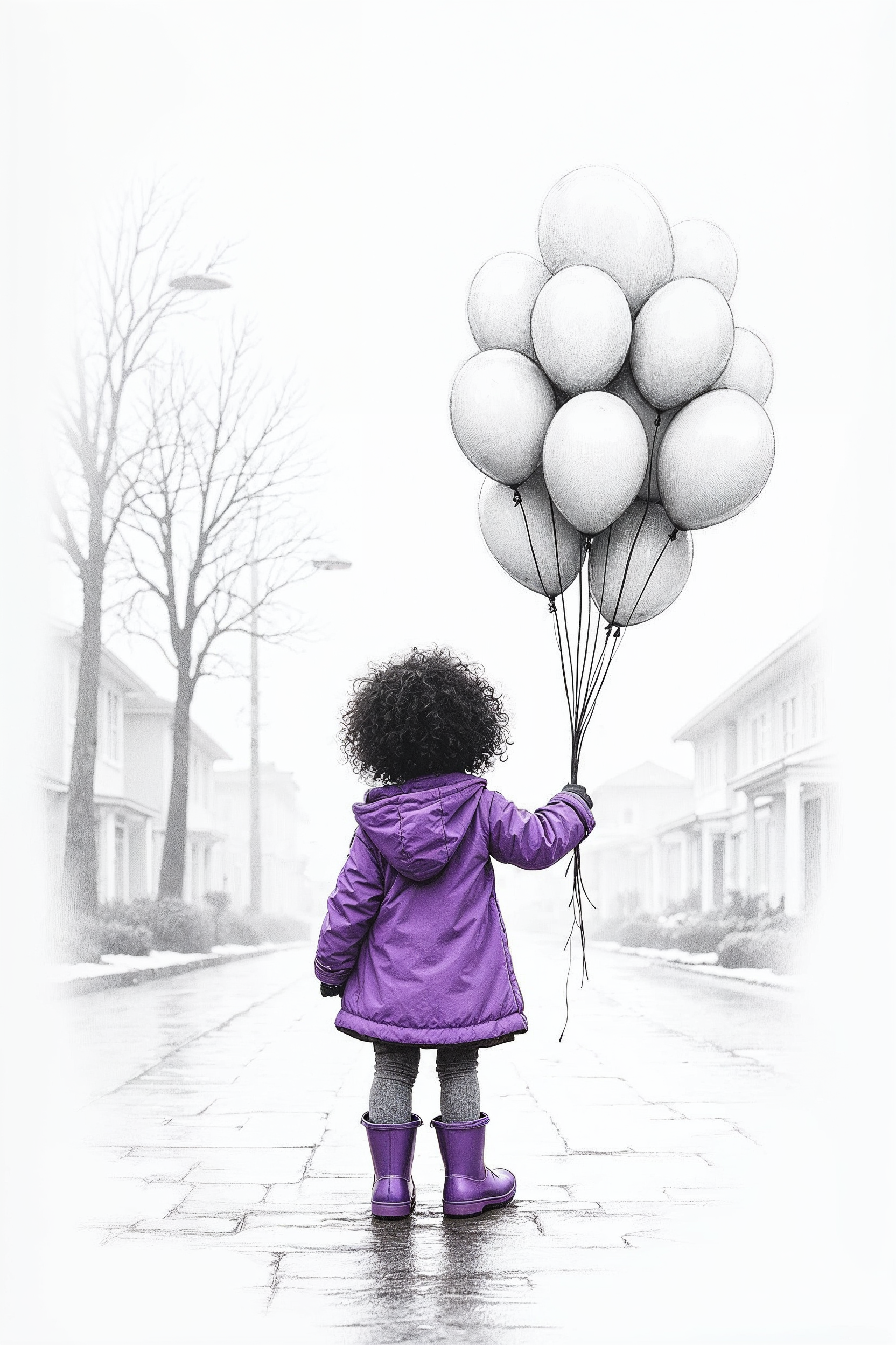 African-American, back view, balloons, child, curly hair, foggy, holding balloons, illustration, purple coat, rain, rain boots, street, trees, urban street, white balloons, girl