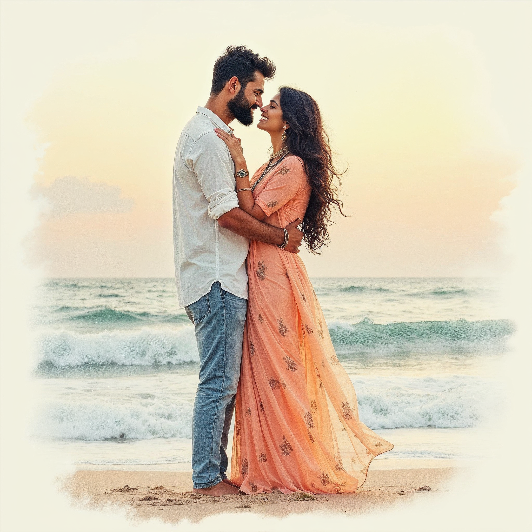 A young Indian man and woman stand closely embracing on a sandy beach at sunset. The man wears a white shirt and jeans, while the woman is dressed in a flowing orange anarkali suit with long dark hair. Gentle waves crash nearby under a warm orange sky.