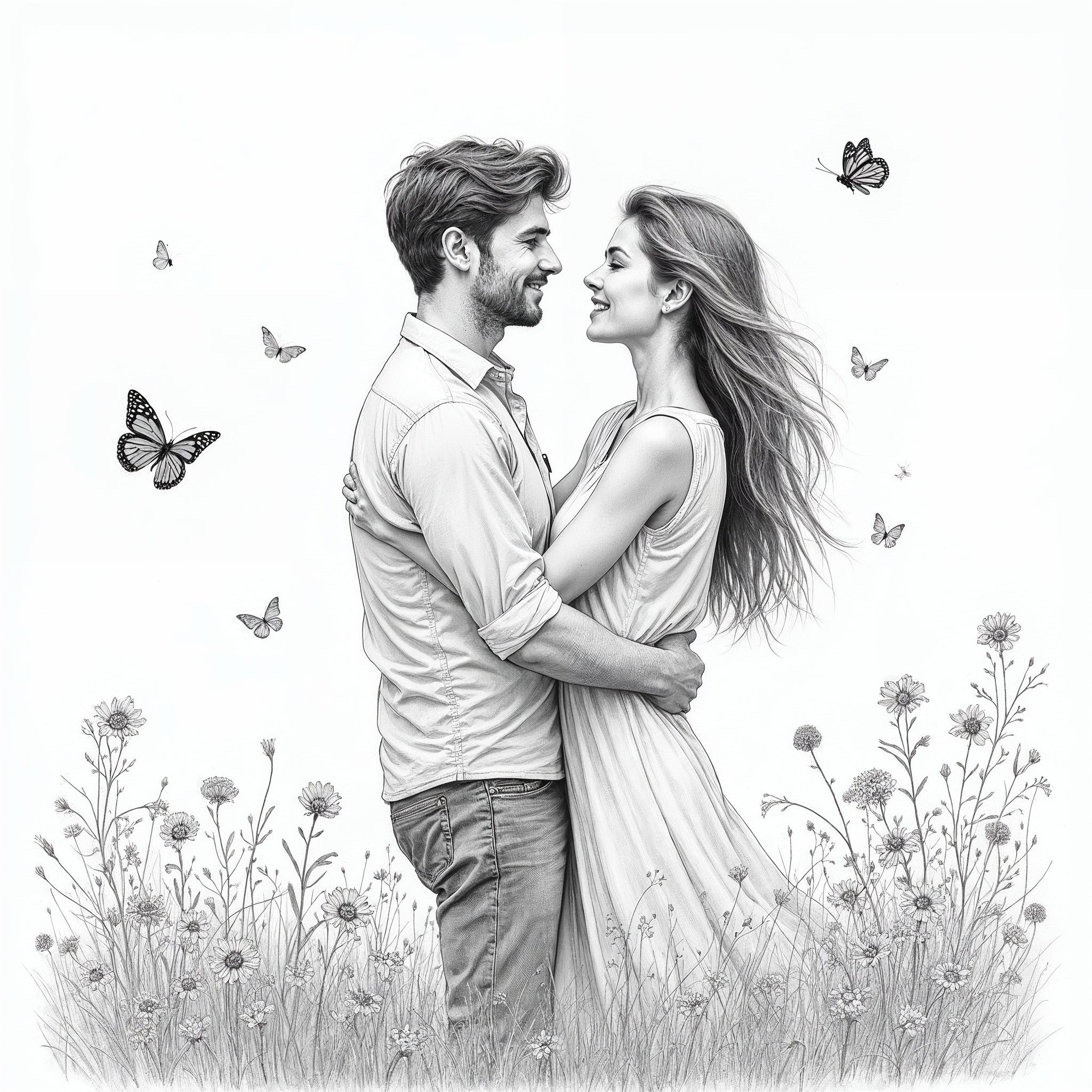 A man and woman gaze lovingly at each other while embracing in a field of flowers. Butterflies flutter around them against a white background. The image is rendered in black and white pencil sketch style.