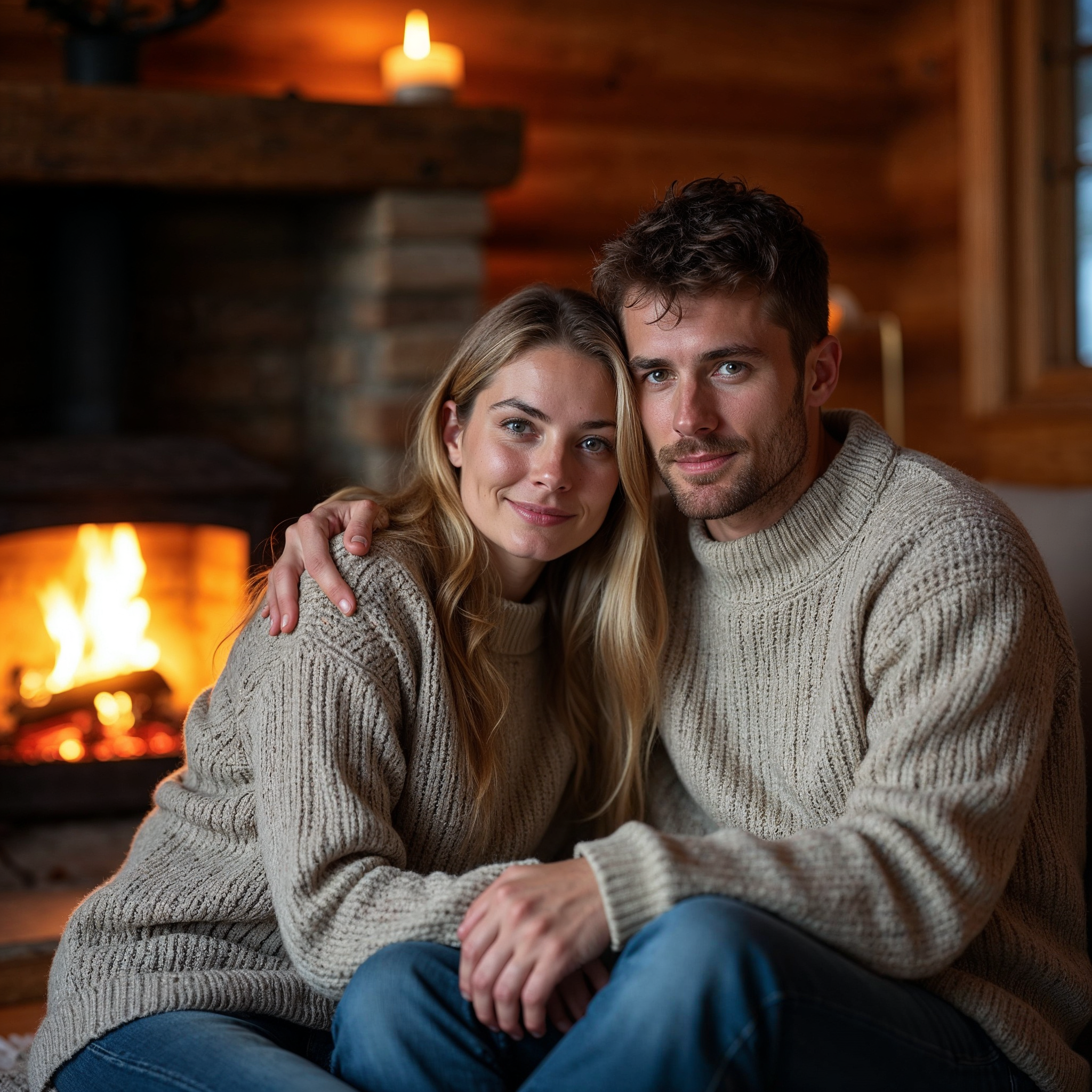 A smiling couple with blonde woman and man with curly hair sits embracing on a couch in a wooden cabin. They wear matching cream-colored knit sweaters and sit in front of a warmly lit stone fireplace with flickering flames. The background features wooden walls and soft lighting from candles.