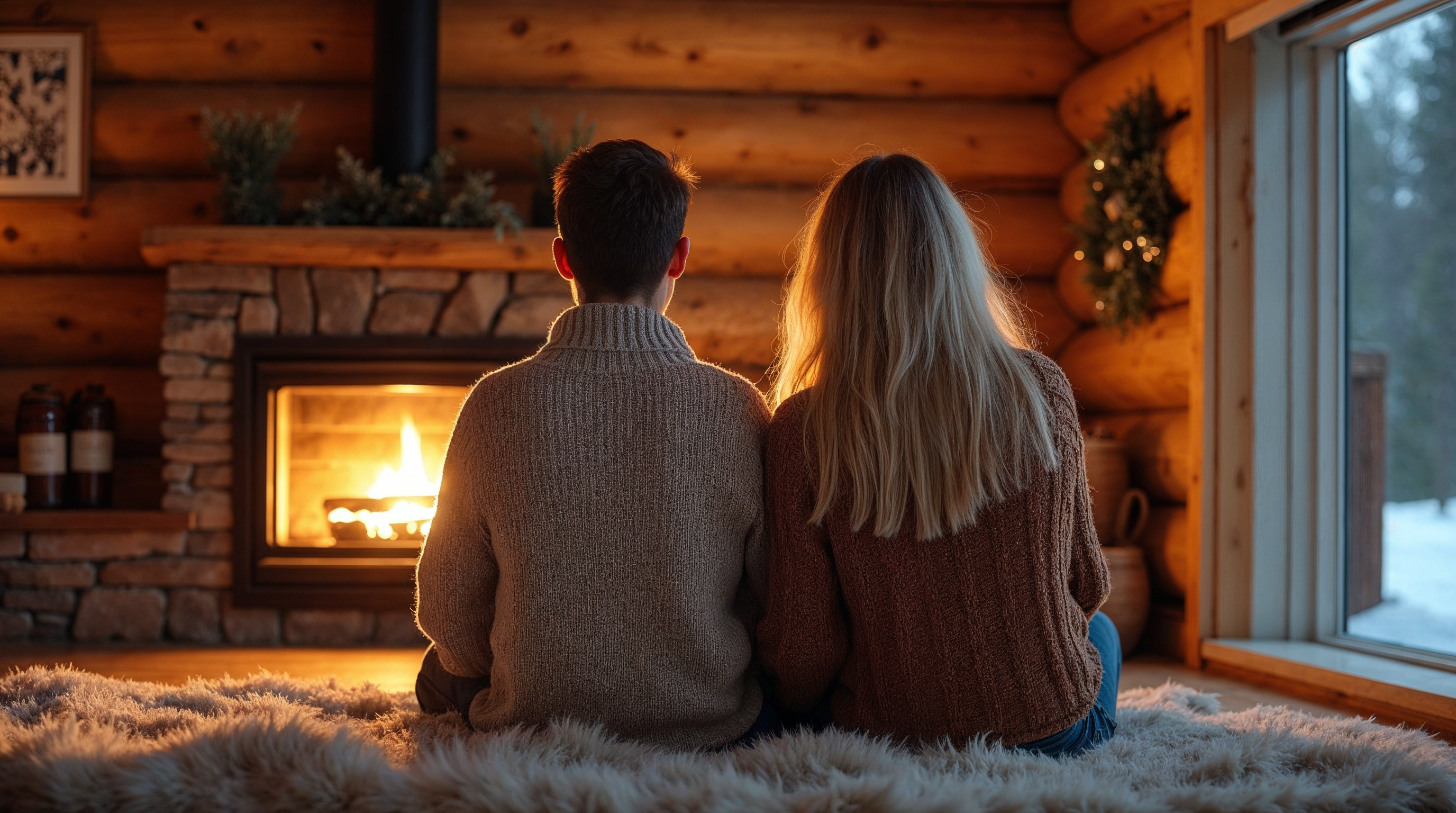 back view, blonde hair, couple together, cozy cabin, evergreen garland, fire flames, fireplace, fluffy rug, indoors, log cabin, man, night time, relaxed pose, romantic, sitting, snowy window, stone hearth, sweaters, warm clothing, wine bottles, winter, woman, wooden walls, couple