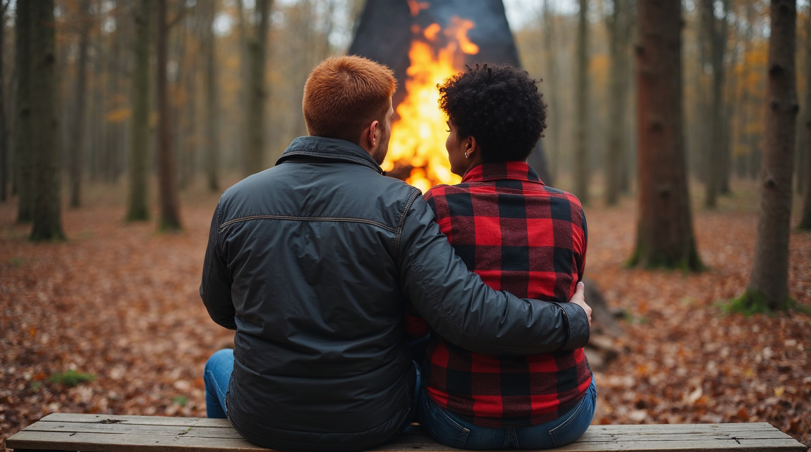African-American, White, autumn trees, back view, bonfire, campfire, curly hair, fallen leaves, flames, forest, interracial couple, jacket, jeans, man, outdoor, plaid shirt, red hair, sitting, woman, wooden bench, woods, couple