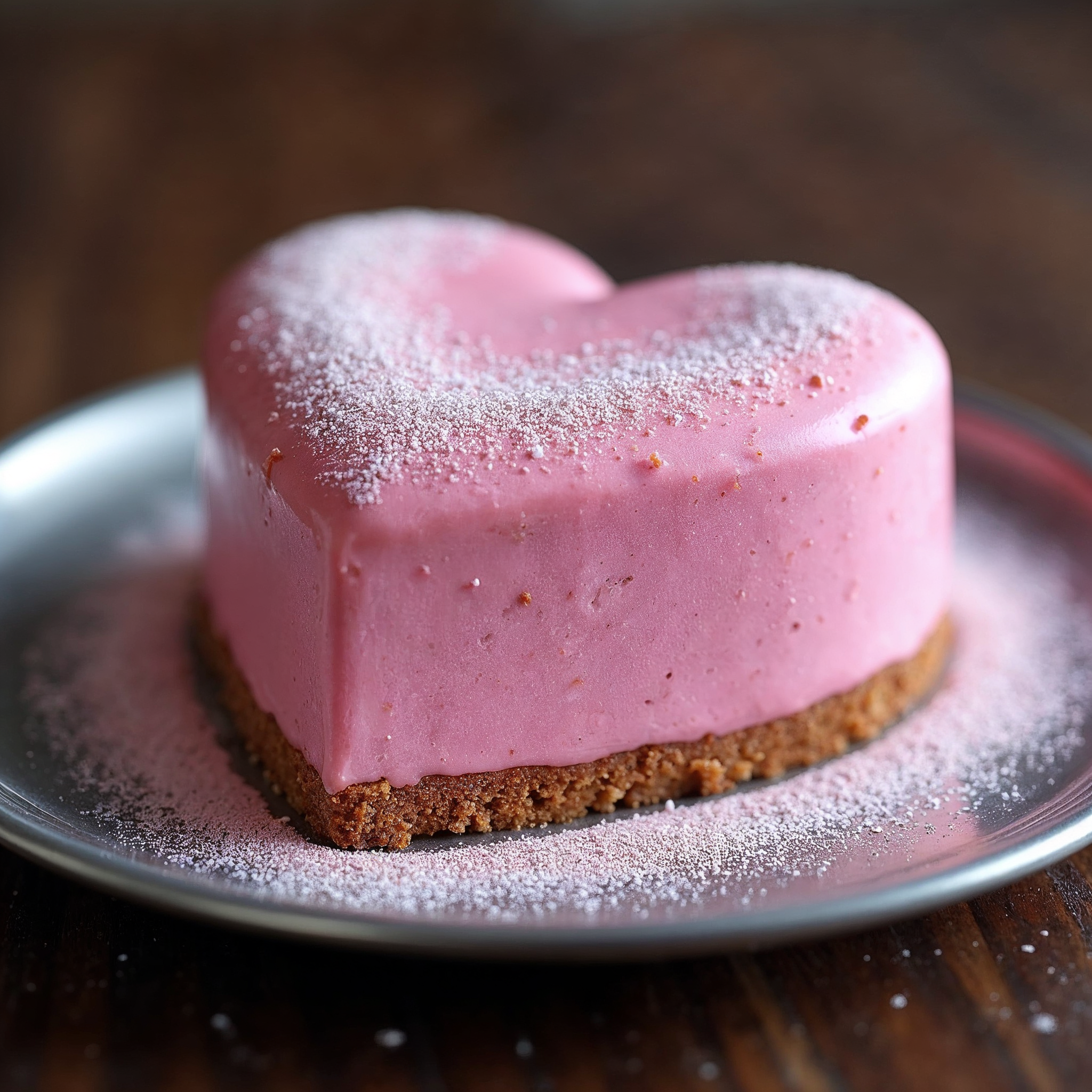 A heart-shaped pink cheesecake with a crumbly crust sits on a silver plate. It is topped with powdered sugar and placed on a wooden surface. The glossy pink surface and powdered sugar dusting highlight its dessert appeal.