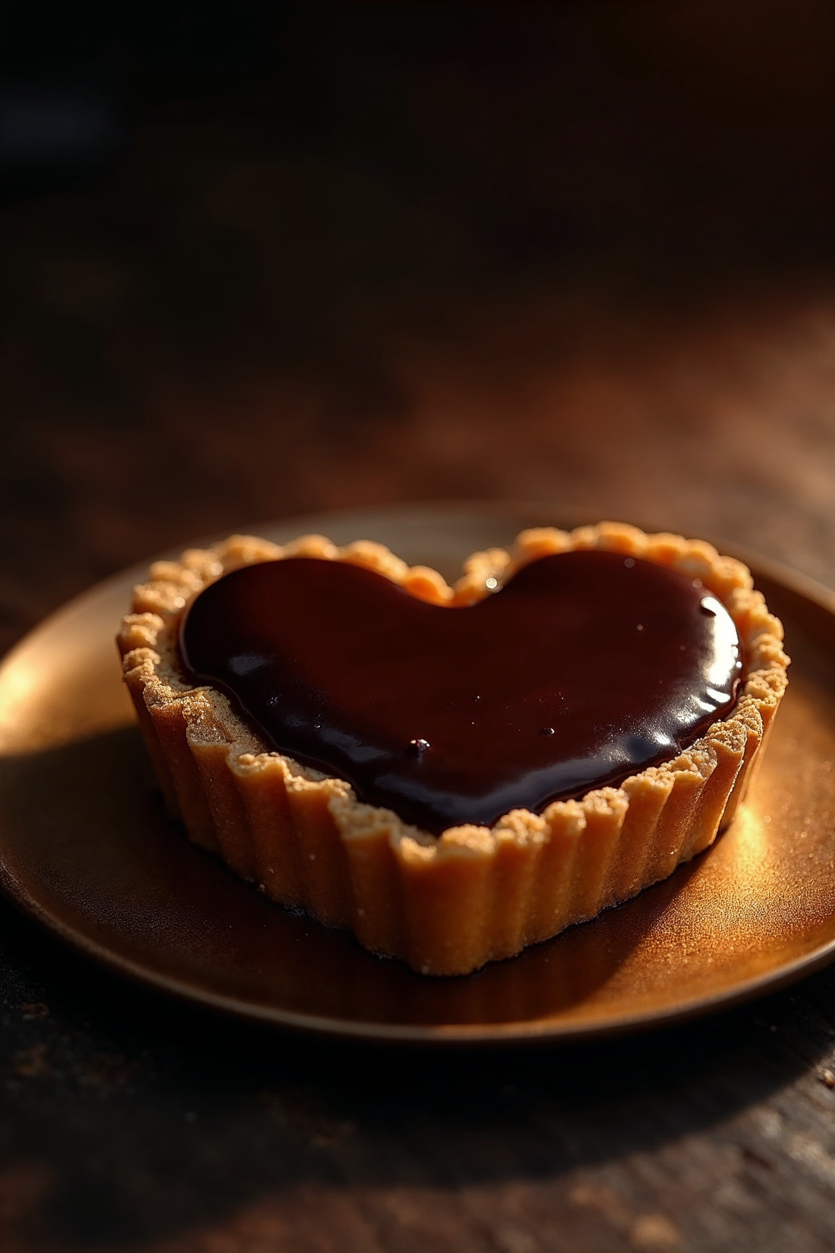 A heart-shaped tart with a golden flaky crust is topped with glossy chocolate ganache. It sits on a small gold plate against a dark wooden background. Warm lighting highlights the rich chocolate surface and textured edges.
