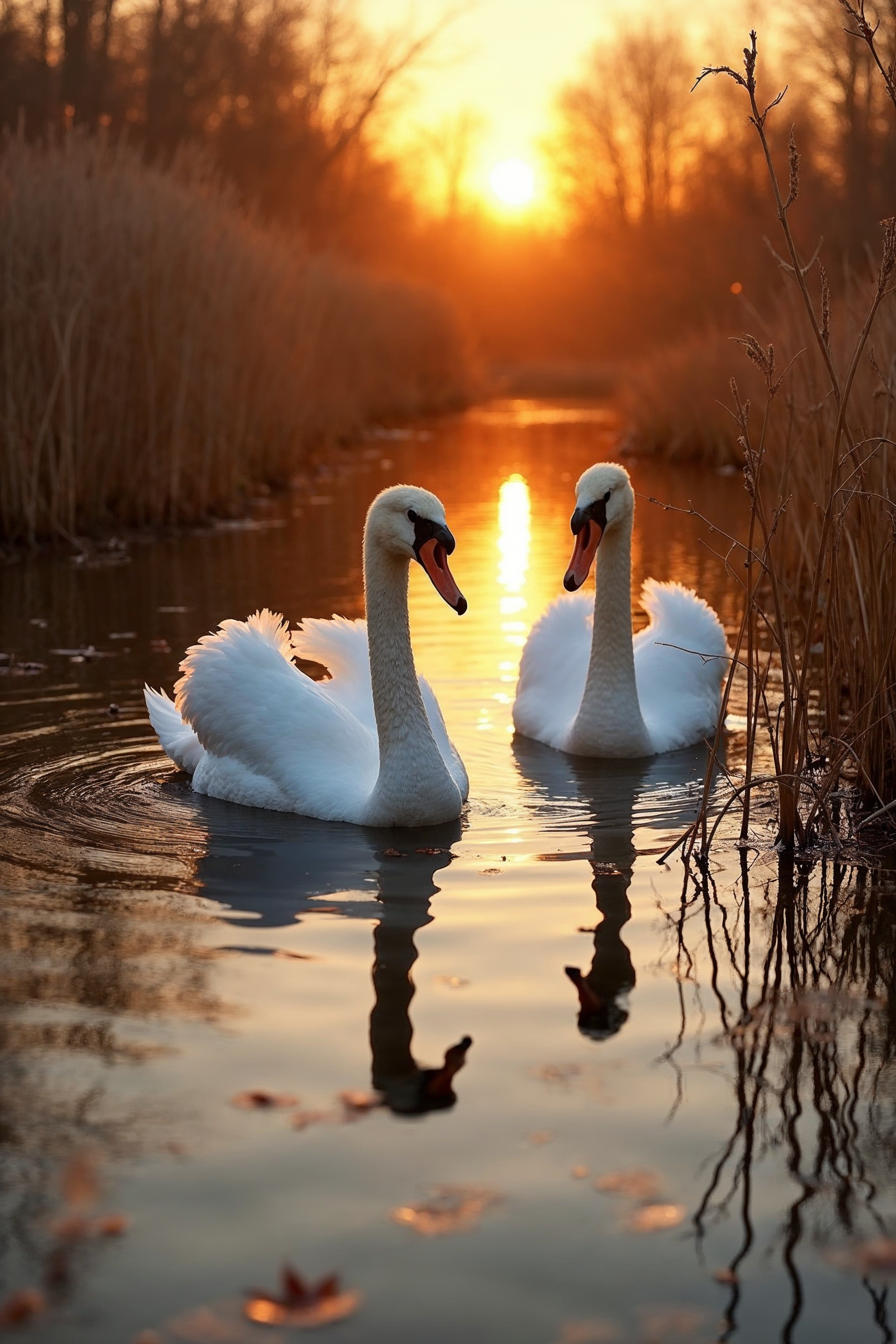 Two white swans swim gracefully in a calm river surrounded by reeds and bare trees. The vibrant orange sunset reflects on the water, creating a warm glow and mirror-like reflections of the swans. Dry reeds and autumn leaves add texture to the serene natural scene.