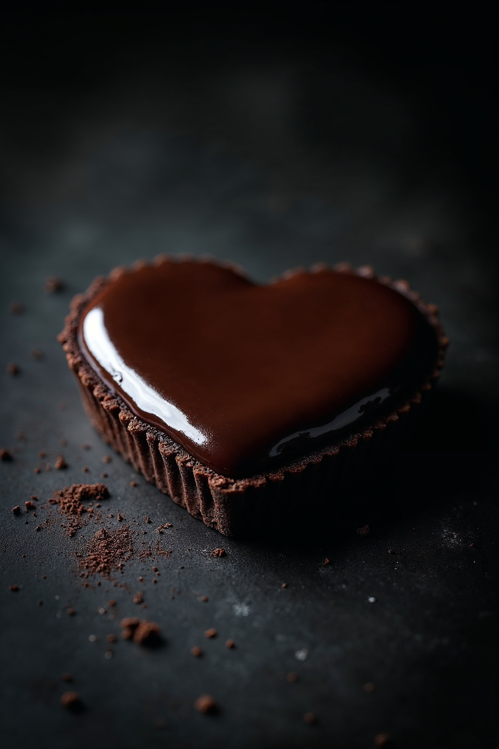 bakery item, cacao, chocolate ganache, chocolate glaze, cocoa powder, dark background, dark surface, dessert, food photography, food styling, glossy chocolate, gourmet chocolate, heart dessert, heart shaped, pastry, shiny topping, sweet treat, tart crust, valentine dessert, chocolate tart