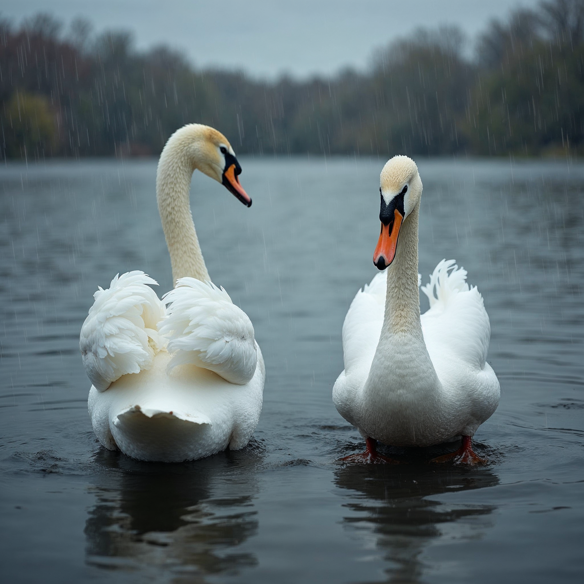 Two elegant white swans swim side by side in a calm lake surrounded by autumn trees. Rain falls gently on the water, creating ripples around their webbed feet. The background features blurred gray skies and bare branches.