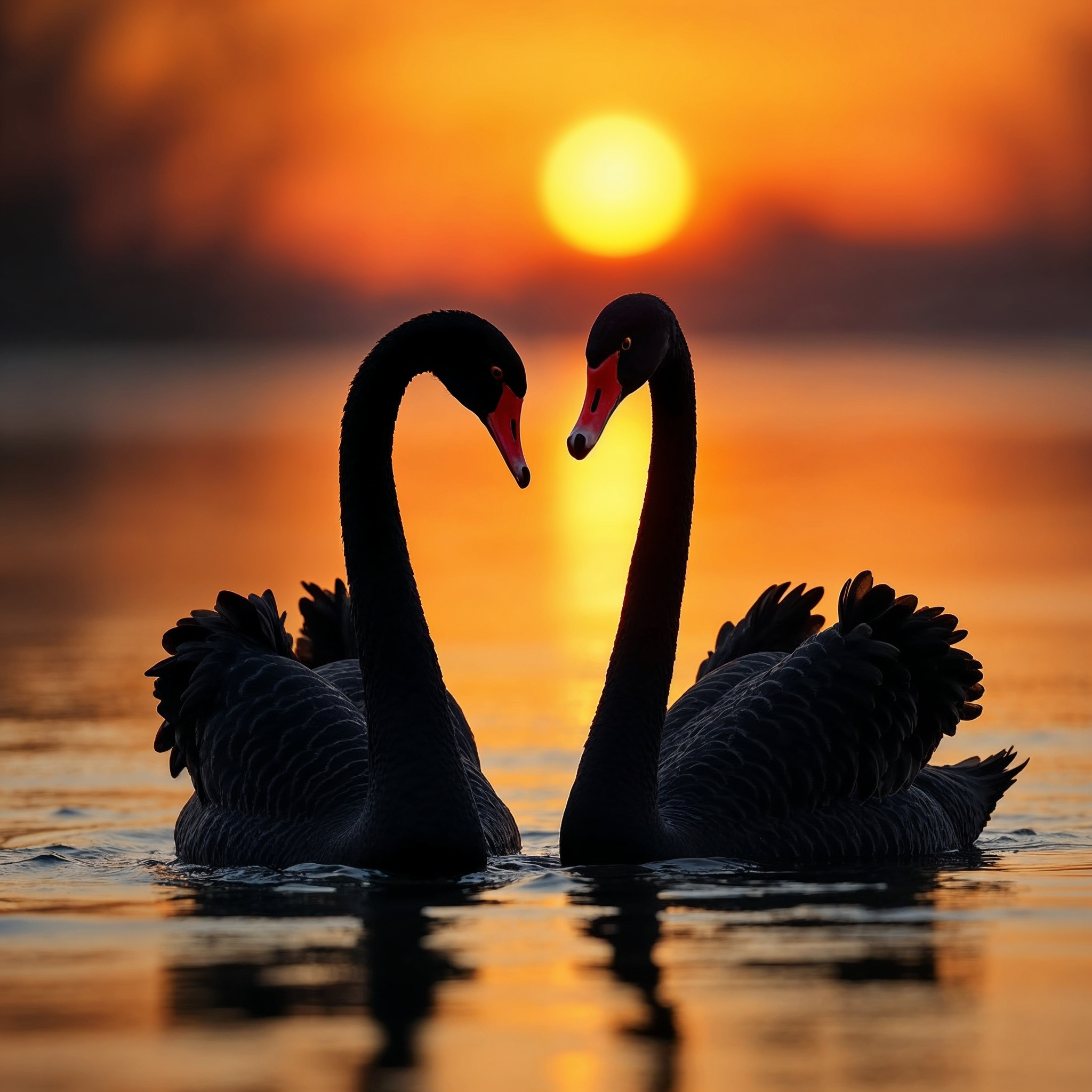 Two black swans swim close together in calm water, their necks curved to form a perfect heart shape. A vibrant orange sunset glows behind them, reflecting on the water surface. Their red beaks touch gently in the center of the heart silhouette.