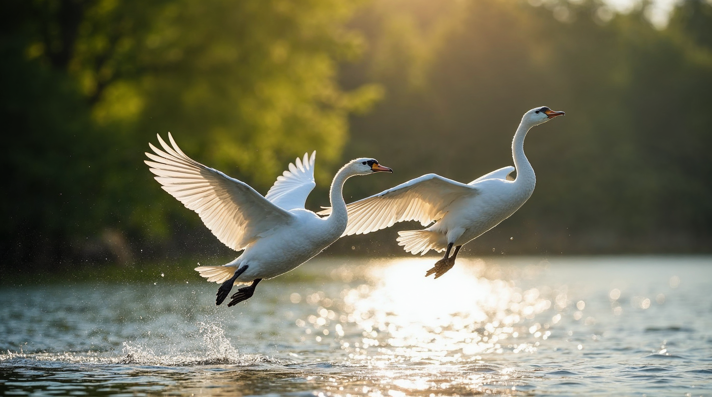 avian, birds, elegant birds, feathers, flying swans, golden sunlight, graceful, green trees, lake, nature, orange beaks, outdoors, serene landscape, splash, sunset light, swan pair, water, waterfowl, white swans, wildlife, wings, swans