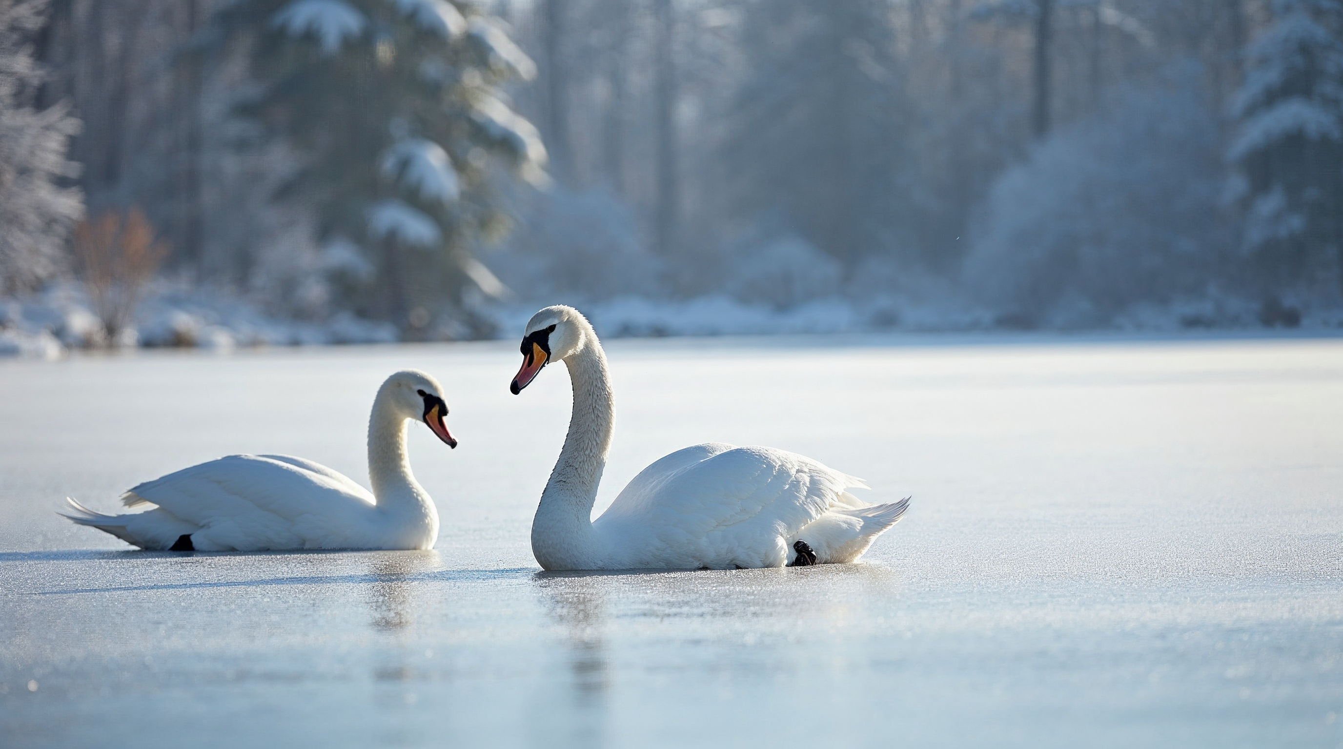 Two white swans with orange beaks face each other closely on a frozen lake surrounded by snow-covered trees. The scene features a soft winter sunlight filtering through the forest, casting a serene glow on the icy water and snowy landscape. Their elegant necks curve gracefully towards one another.
