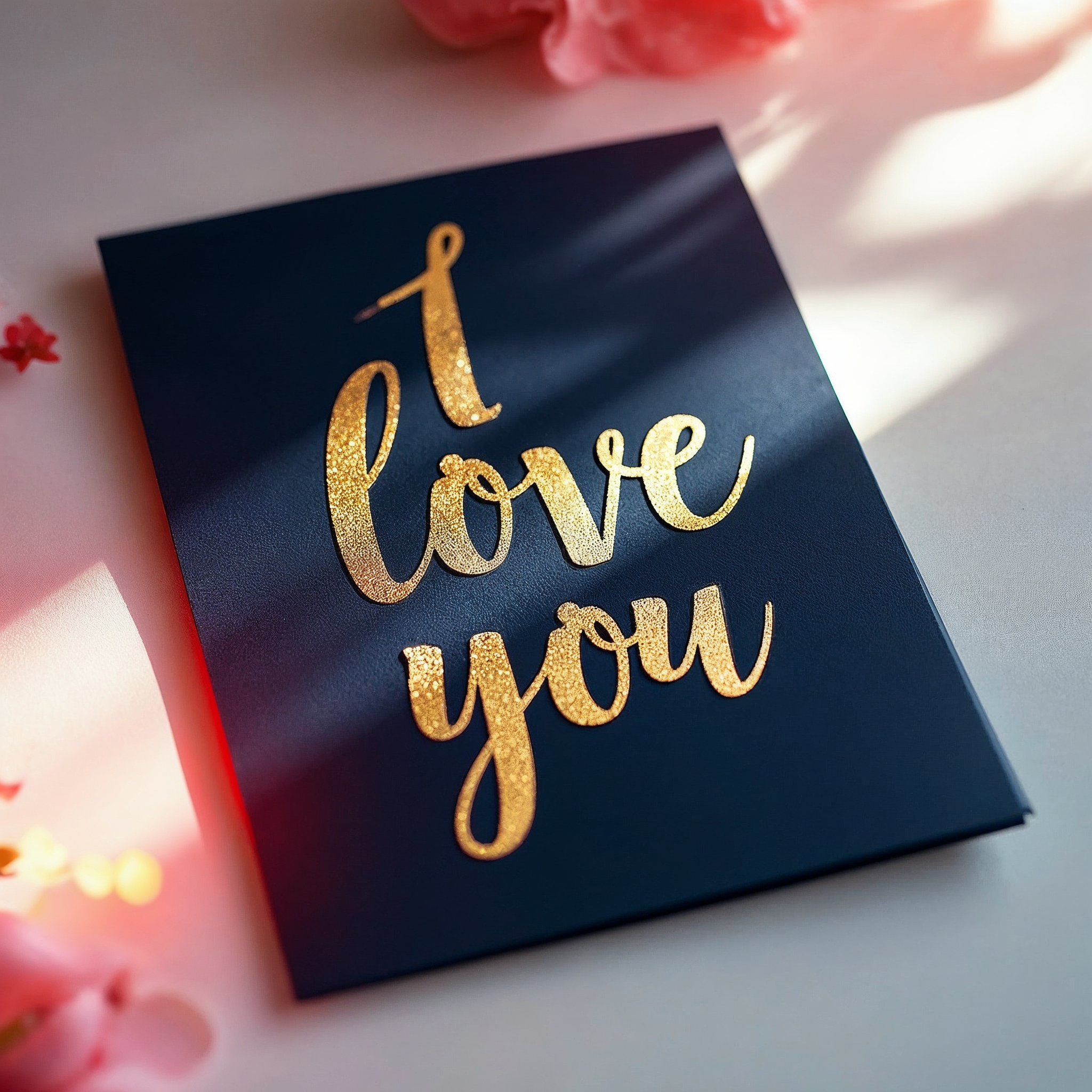 anniversary card, blue card, cursive font, flowers, foil lettering, gold lettering, gold text, greeting card, holiday card, love card, love message, navy card, pink petals, romantic card, sunlight, valentine card, white background, I love you