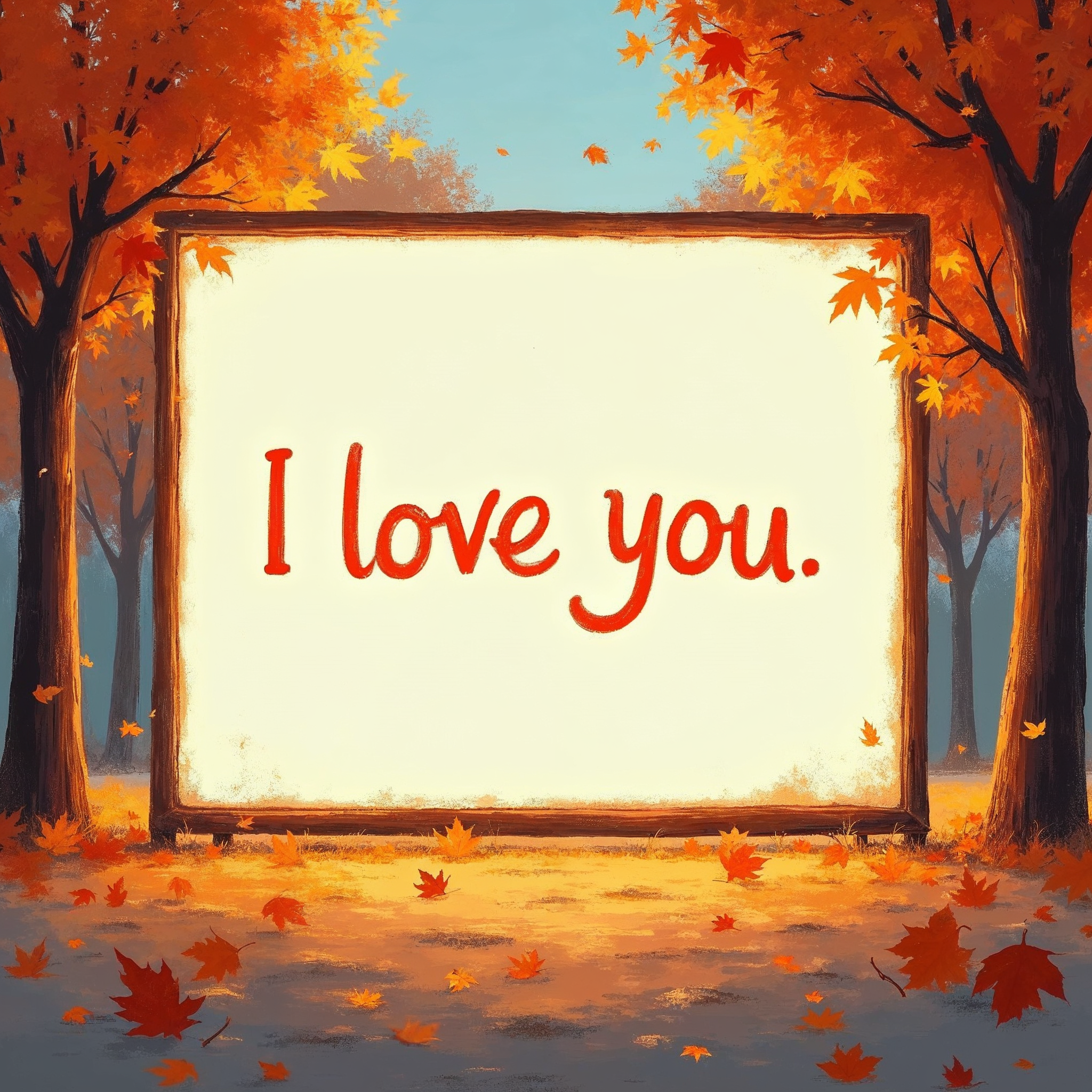 An illustration features a large wooden sign framed by tall autumn trees with vibrant orange and red leaves. The sign displays the bold red text 'I love you.' Scattered fall leaves cover the ground beneath a blue sky.