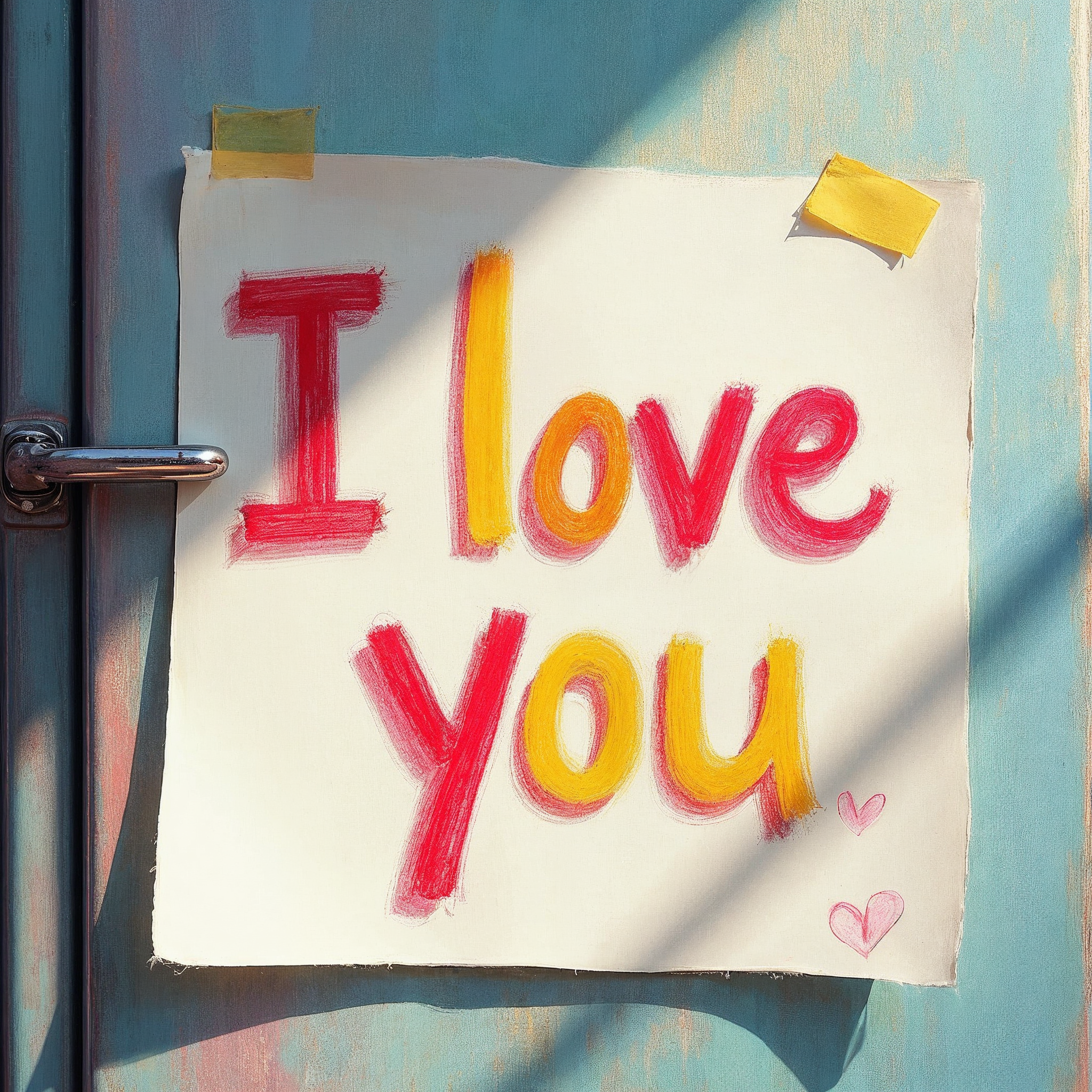 A white paper sign with 'I Love You' written in bold red, orange, and yellow letters is taped to a weathered turquoise door. Yellow tape secures the corners, and small red hearts decorate the bottom. Sunlight casts shadows across the rustic door and sign.