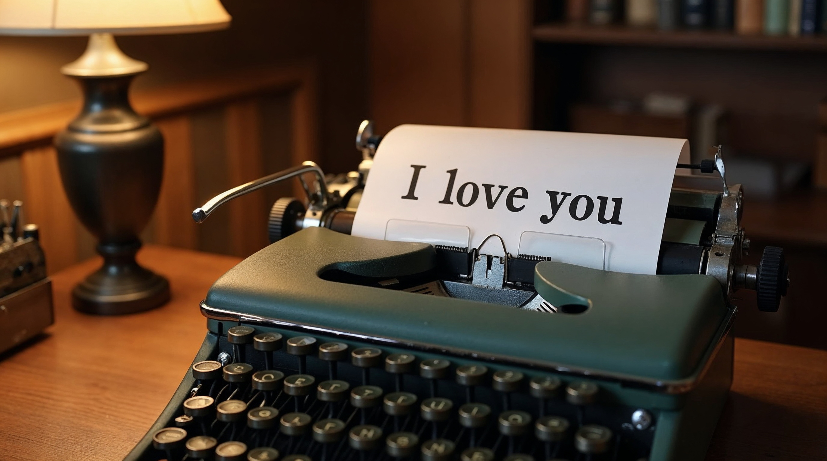 A green vintage typewriter sits on a wooden desk with a paper sheet typed 'I Love You' inserted. A brass lamp with a beige shade illuminates the scene from the side. Bookshelves and wooden paneling appear in the warm, dimly lit background.
