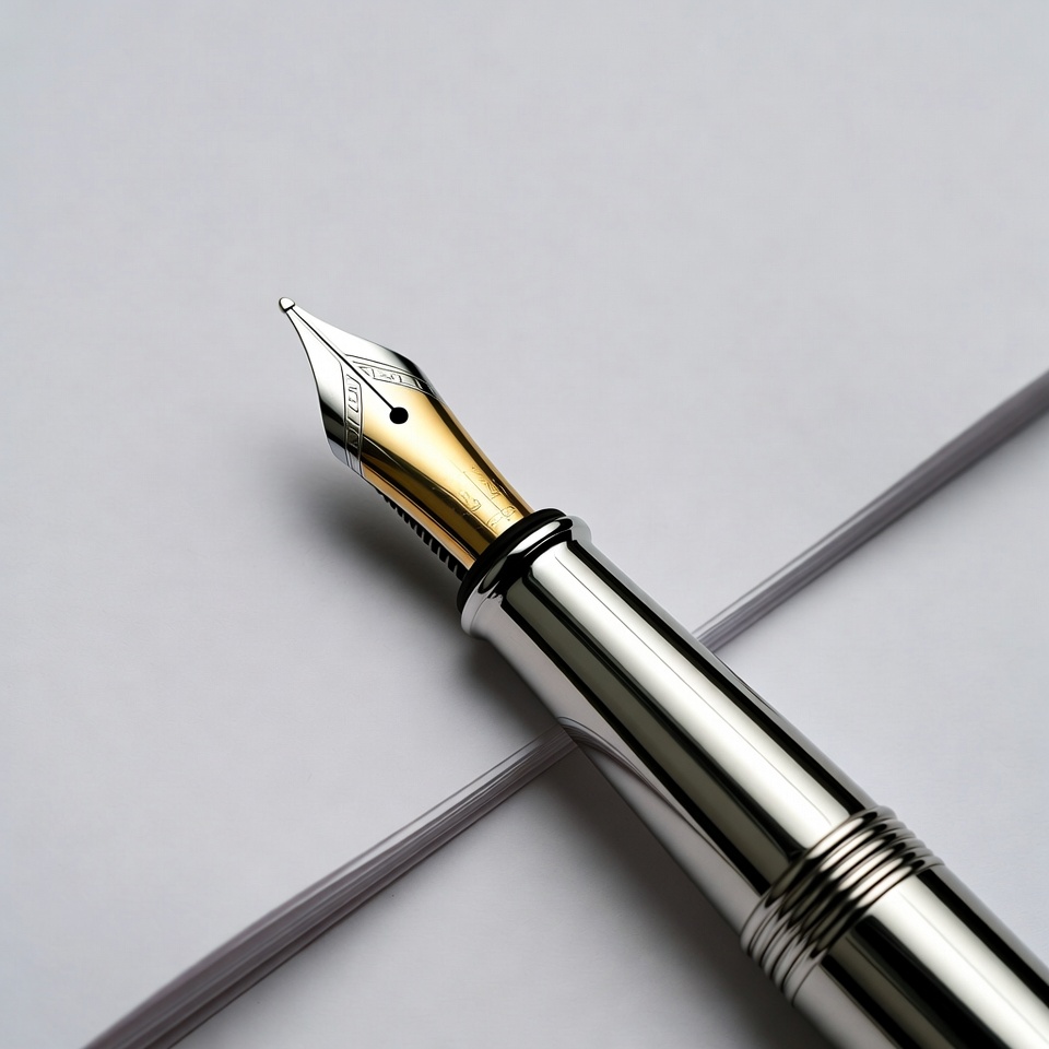 calligraphy pen, diagonal angle, engraving, gold nib, gold tip, ink pen, isolated background, luxury pen, office supply, pen barrel, pen closeup, shiny metal, silver pen, white paper, writing instrument, fountain pen