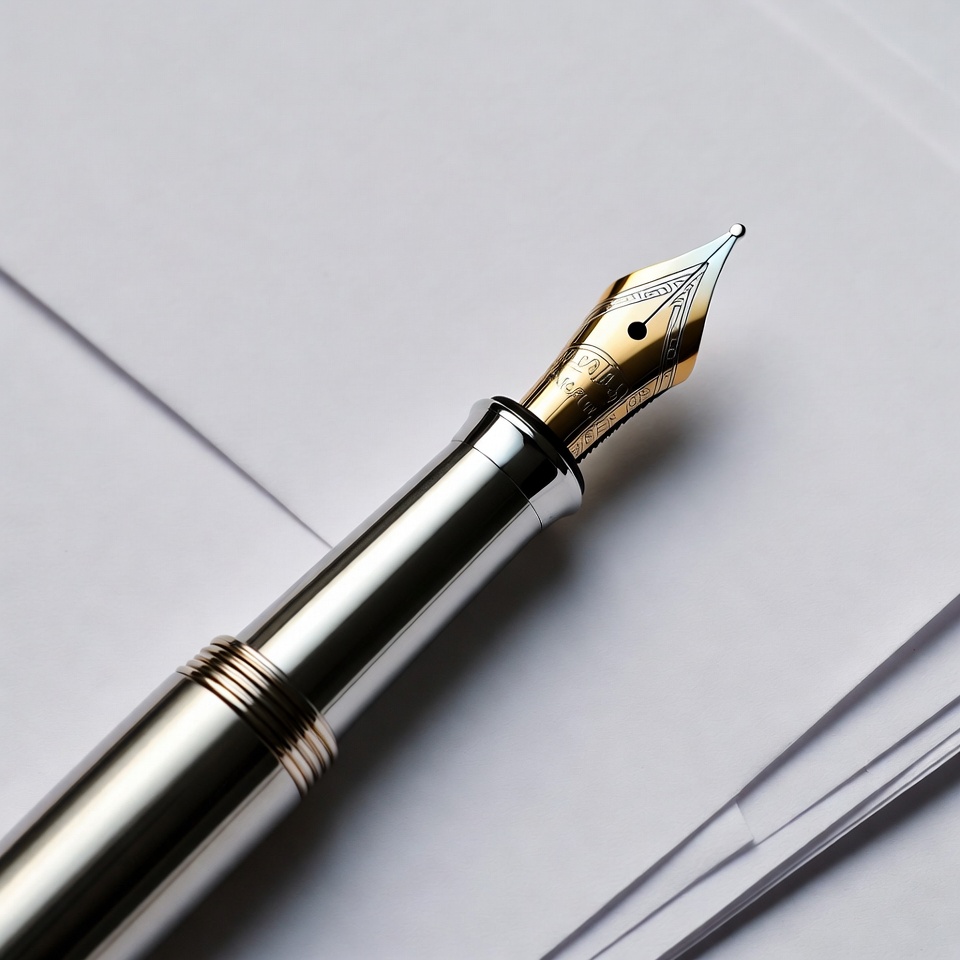 closeup, detailed nib, elegant pen, gold accents, gold nib, ink pen, isolated background, luxury pen, metal pen, office supplies, paperwork, silver barrel, white papers, writing instrument, fountain pen