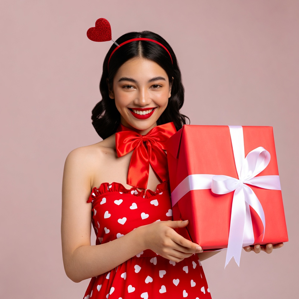 A smiling Asian woman with long wavy black hair wears a red heart headband and a red polka dot dress with a large bow. She holds a big red gift box wrapped with a white ribbon in front of a pink background. Her makeup features red lips and she has a joyful expression.