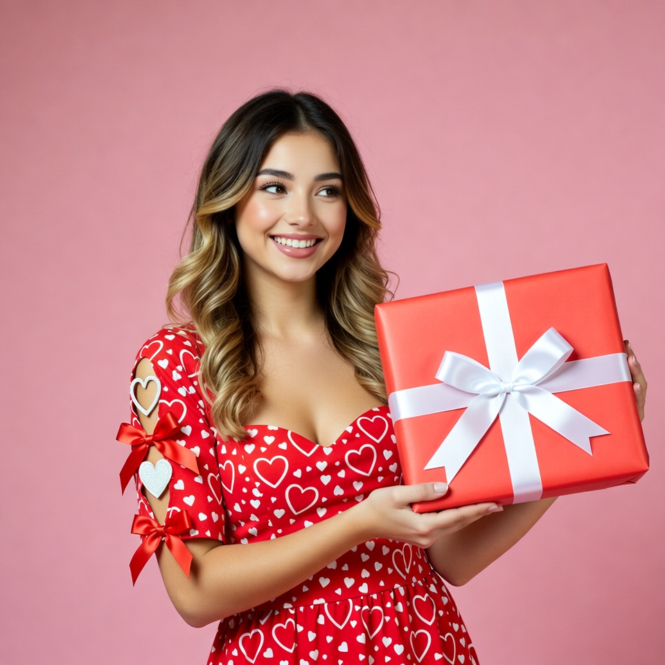 A young woman with long wavy brown hair smiles happily while holding a large red gift box wrapped with a white ribbon. She wears a red dress adorned with white heart patterns and small heart details on the sleeves. The image features a solid pink background.