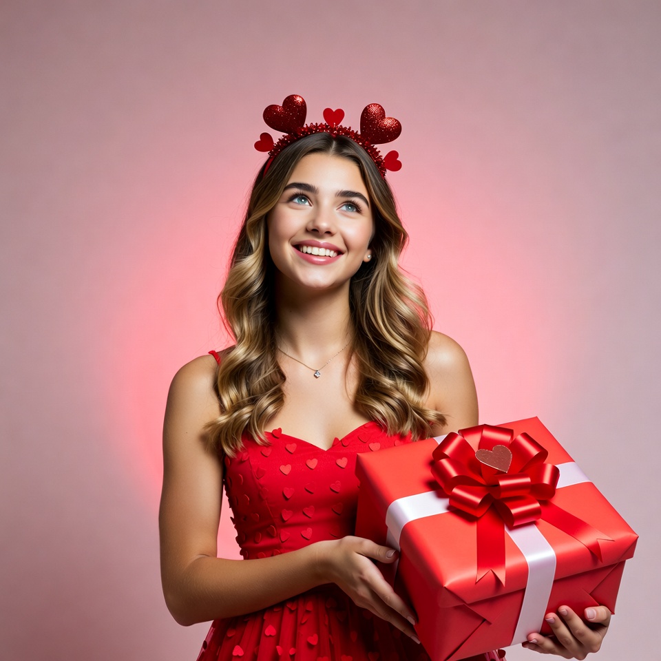 A young woman with wavy blonde hair and blue eyes smiles while holding a large red gift box topped with a red bow. She wears a sparkling red dress and a heart-shaped headband with red hearts. The image features a bright pink background.