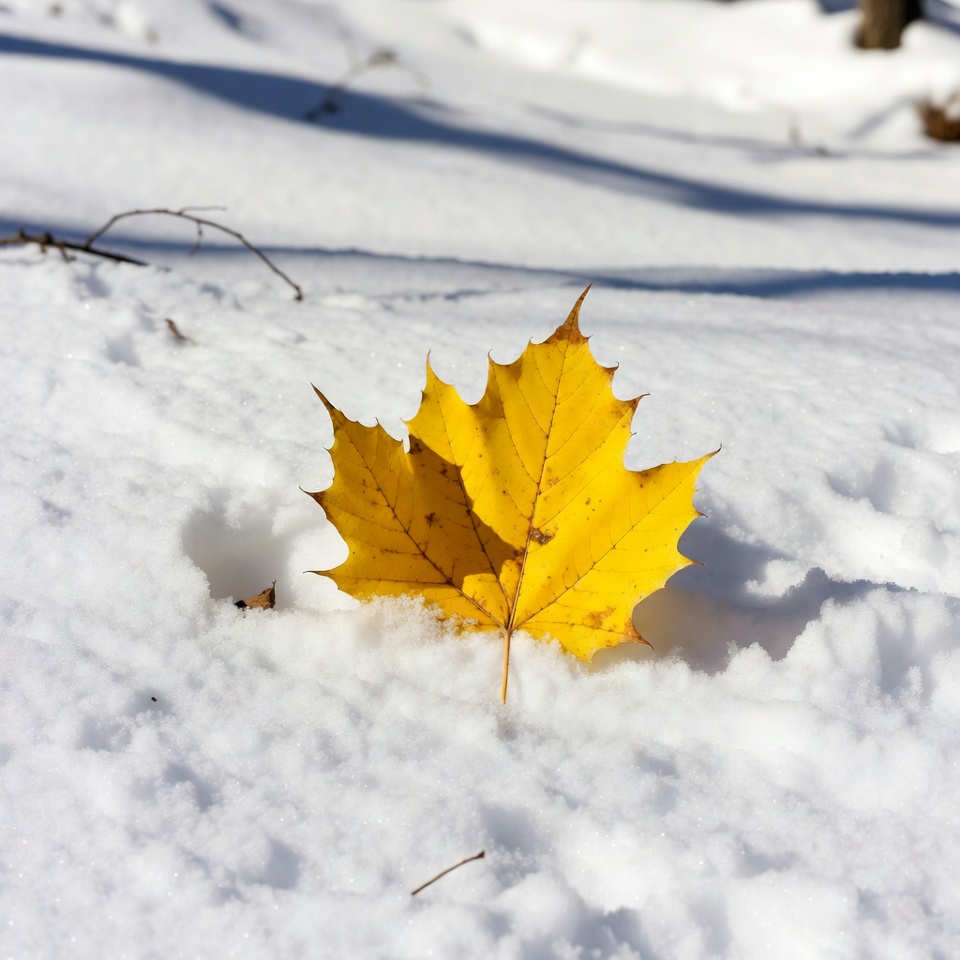 A vibrant yellow maple leaf with distinct pointed lobes lies on a snowy ground. Sunlight casts shadows around the leaf, highlighting its texture against the white snow. Fallen twigs and branches are visible nearby.