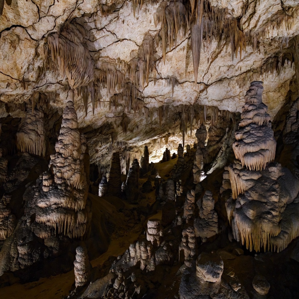 cave ceiling, cave interior, cavern, cavern chamber, dark cave, dim lighting, dripstone, earthy tones, exploration, geology, illuminated, karst, limestone, mineral deposits, natural cave, rock formations, rugged walls, speleothem, stalactites, stalagmites, stone pillars, underground, cave