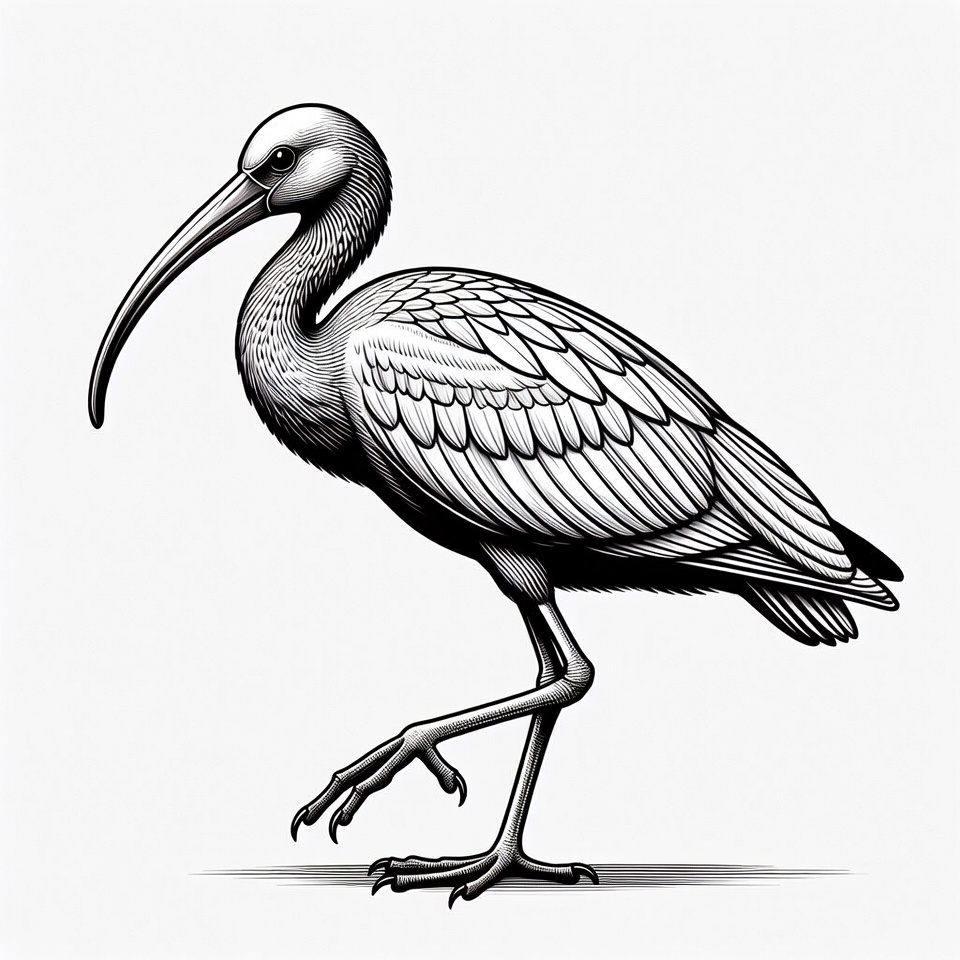 bird, black and white, curved beak, engraving, feathers, ibis bird, illustration, isolated background, line art, long legs, vector art, wading bird, walking bird, wildlife, ibis