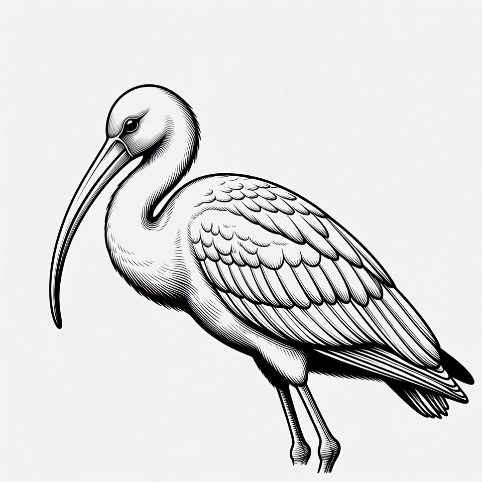 A detailed black and white line drawing of an ibis bird standing with its characteristic curved beak. The illustration features intricate feather patterns and is set against an isolated white background. The bird faces slightly to the side, showcasing its elegant neck and legs.