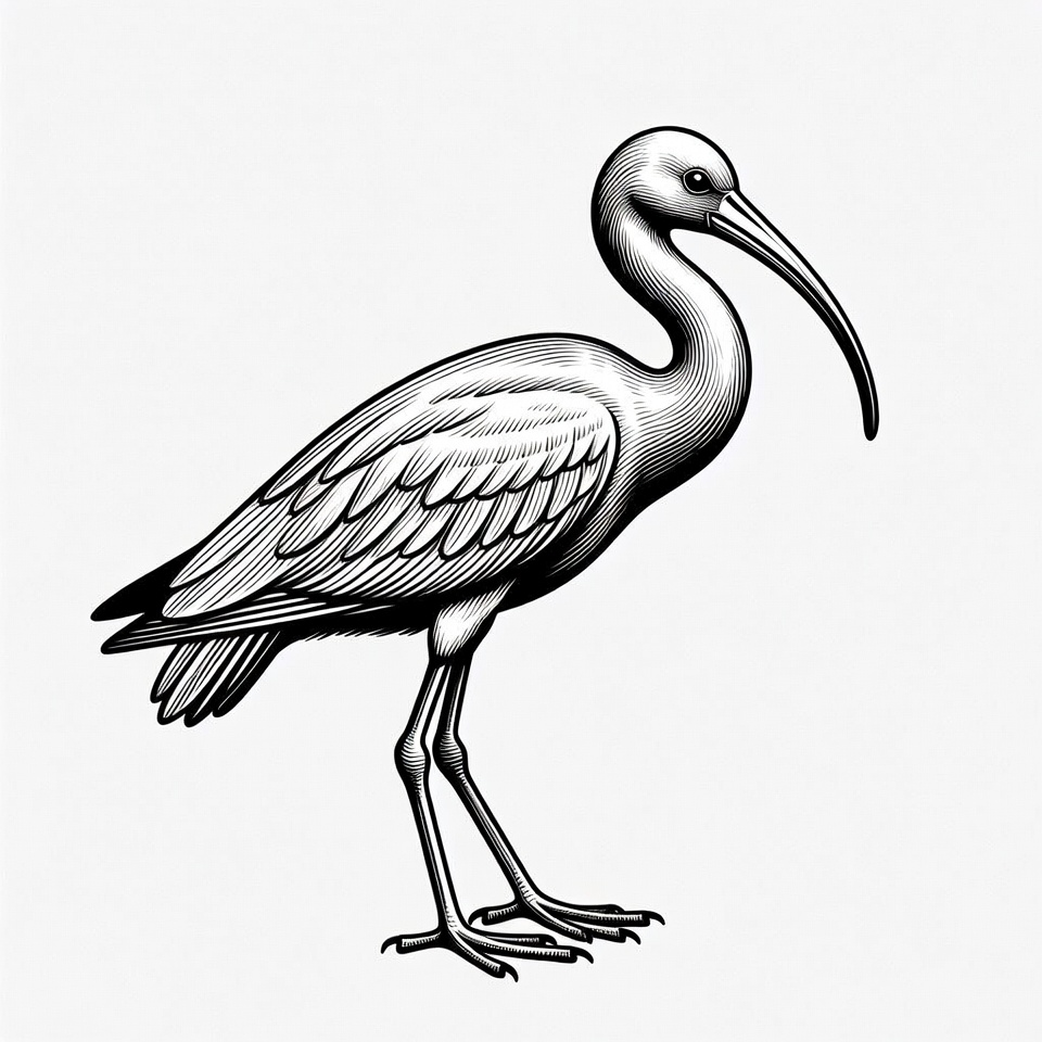 avian, bird, black and white, clipart, curved beak, engraving, feathers, ibis, illustration, isolated background, legs, line art, long beak, standing bird, vector, wading bird, wildlife, ibis bird