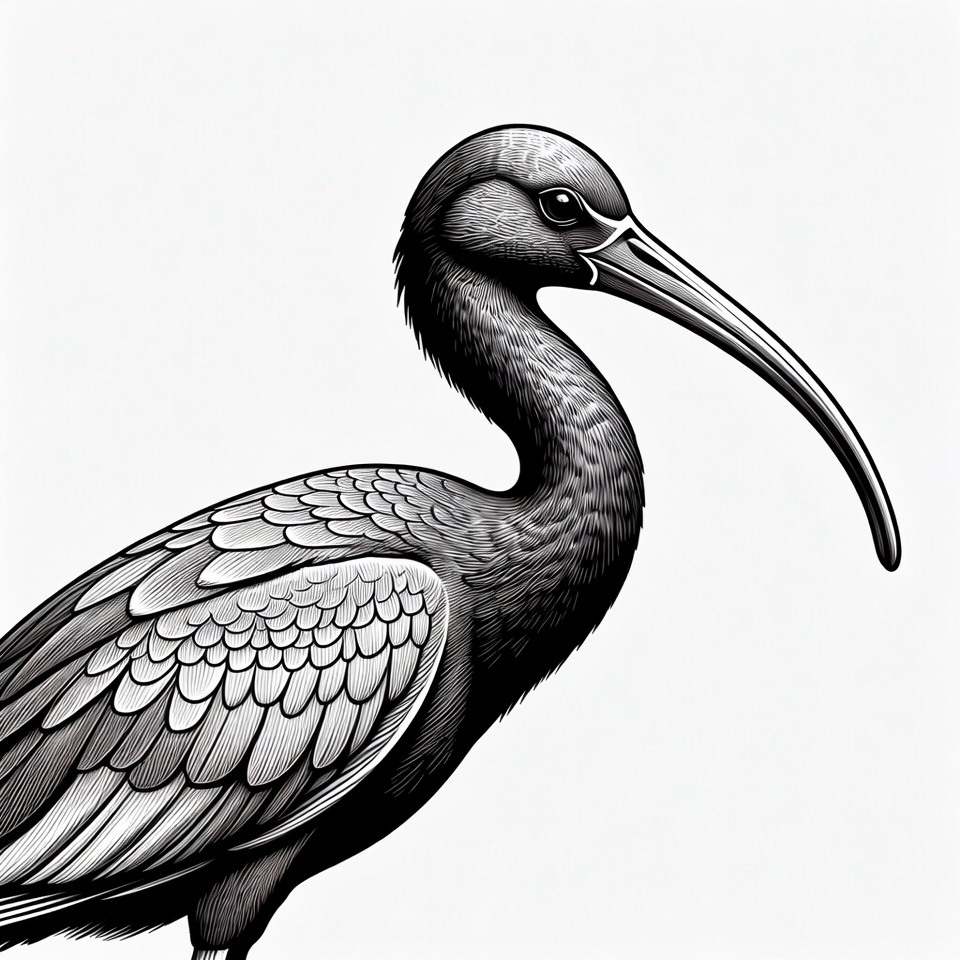 animal illustration, bird illustration, bird profile, black bird, black ibis, curved beak, detailed feathers, engraved style, feathers, ink drawing, isolated background, line art, long neck, nature drawing, sharp eye, vector art, wading bird, wildlife art, wings, ibis bird