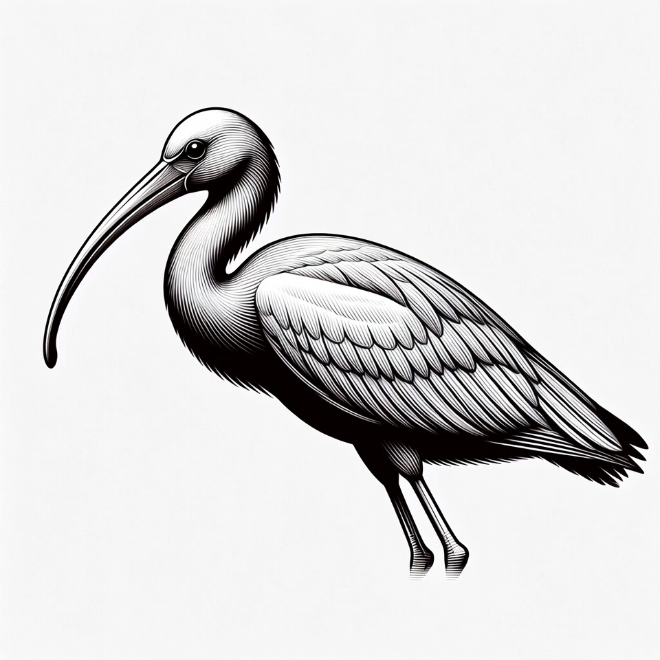animal, bird, black and white, curved beak, detailed drawing, engraving style, feathers, illustration, isolated background, line art, long legs, standing bird, wildlife, ibis