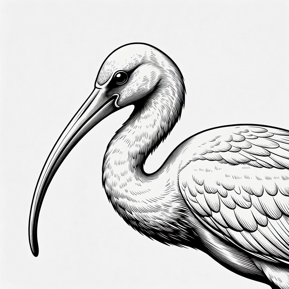 animal, bird, black and white, clipart, curved beak, engraving style, feathers, illustration, isolated background, line art, long neck, profile view, wildlife, ibis