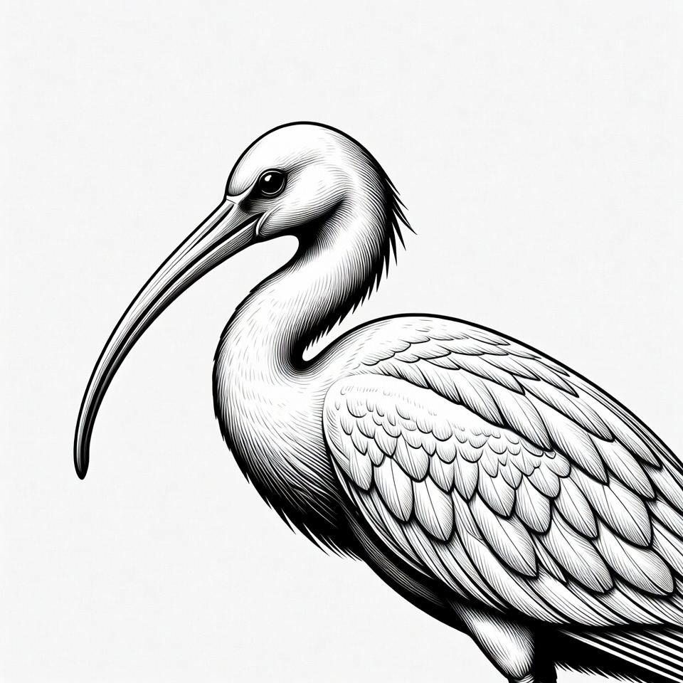 A detailed black and white illustration of an ibis bird with a long curved beak. The bird stands with its neck arched and feathers detailed in fine line art. It is depicted on an isolated white background.