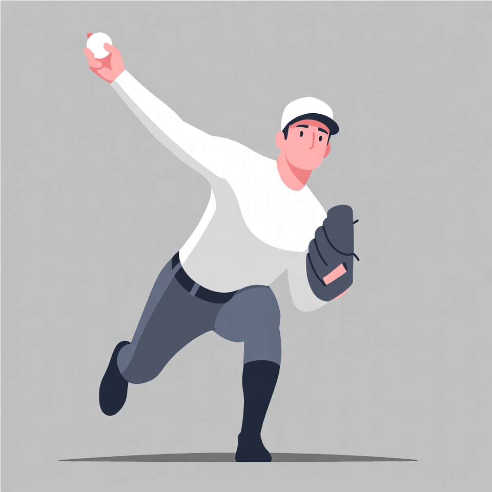 A cartoon illustration of a male baseball pitcher in mid-throw on a gray background. He wears a white uniform with gray pants, black baseball glove, and white cap. His right arm is extended holding a white baseball while his left leg is lifted dynamically.