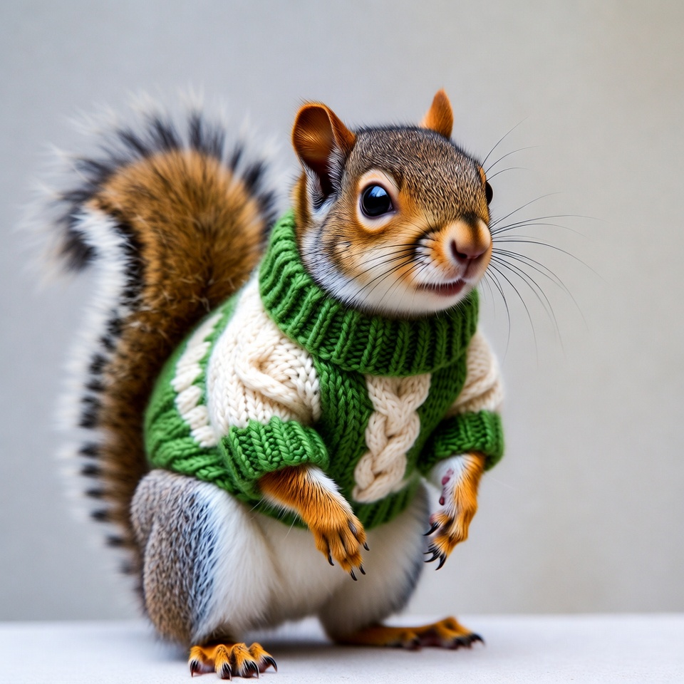 A cute squirrel with brown and white fur stands on a white surface wearing a cozy green and white cable-knit sweater. Its large eyes and fluffy tail are prominently visible, and it has an alert expression. The sweater fits snugly around its body and paws.