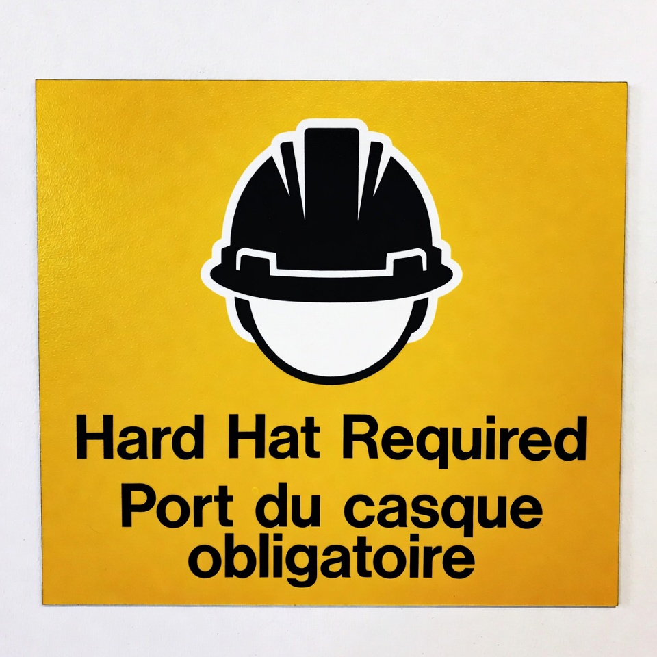 A yellow safety sign features a black hard hat icon over a white face silhouette. Bold text reads 'Hard Hat Required' in English and 'Port du casque obligatoire' in French. The sign has a square shape with white outlines on a bright yellow background.