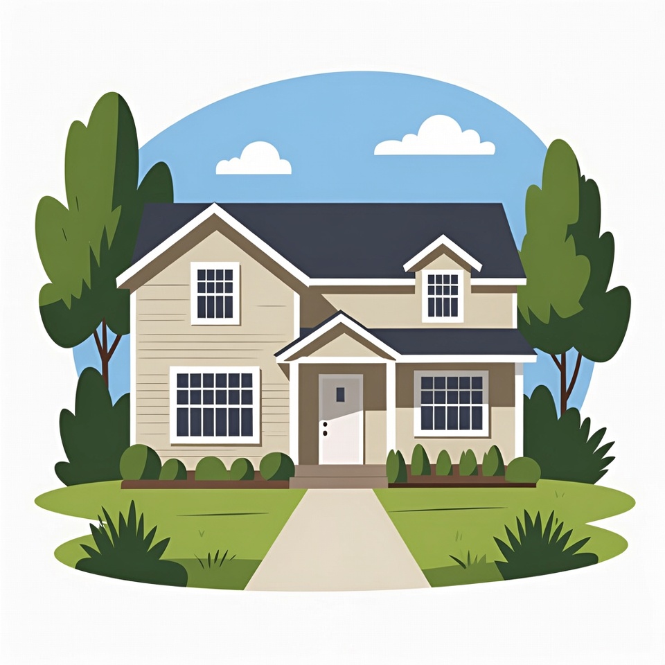 A colorful cartoon illustration of a beige two-story house with a dark shingled roof and white-trimmed windows. Tall green trees frame the house on both sides, with manicured bushes and a green lawn in the front. A concrete walkway leads to the front door under a small porch, all set against a blue sky with white clouds.