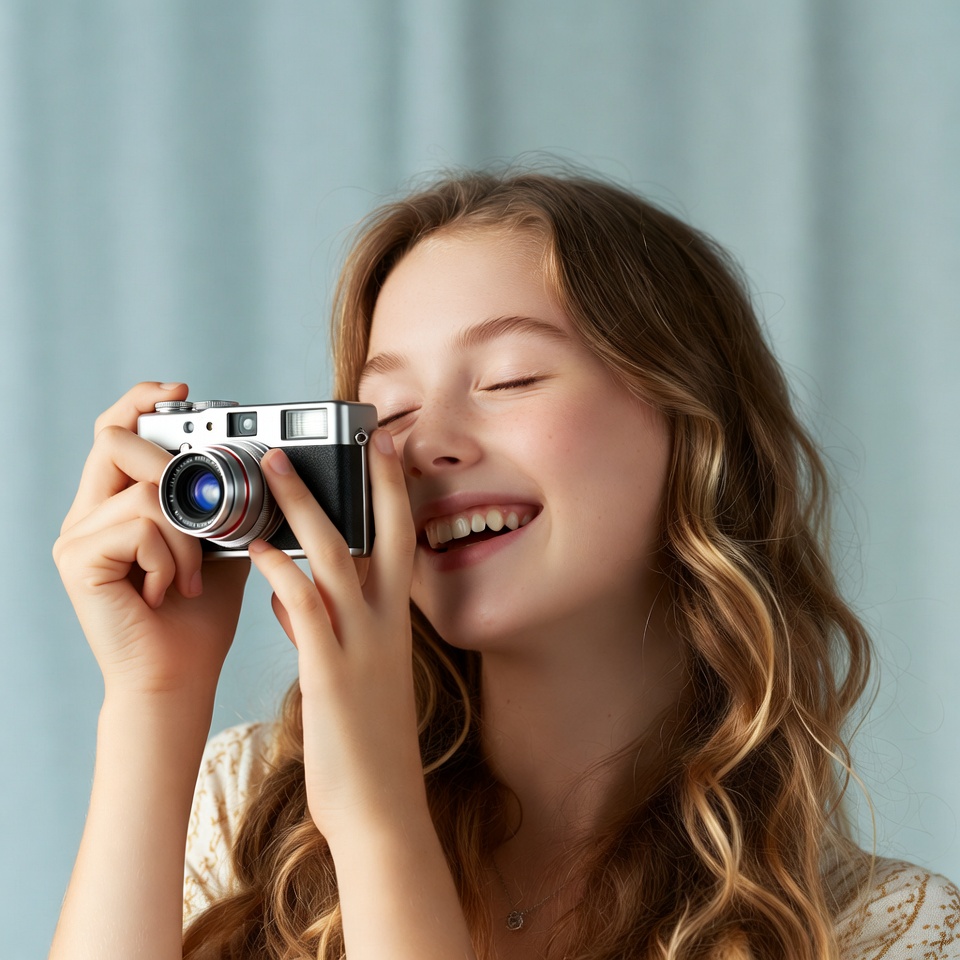 A young girl with long wavy brown hair holds a silver vintage camera up to her face against a light blue background. She has her eyes closed, smiling widely with rosy cheeks. She wears a light-colored top with a necklace.