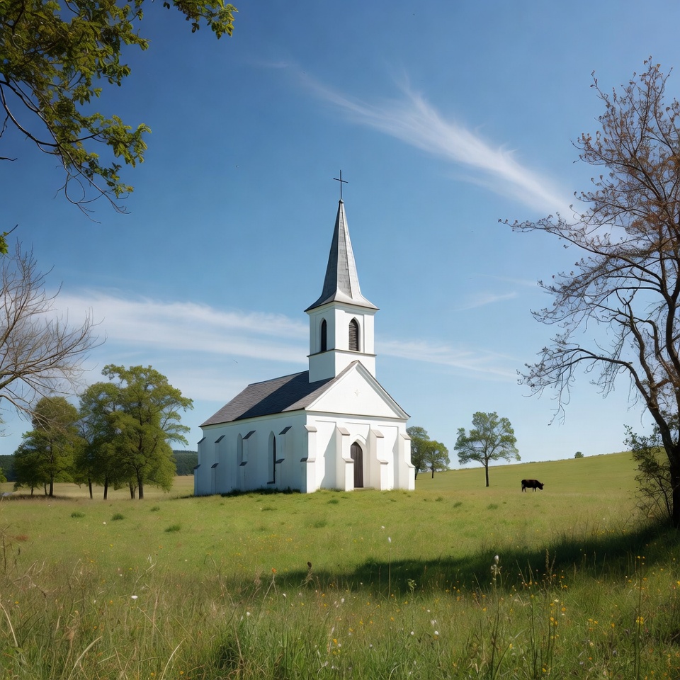 White Steepled Church in Grassy Field
