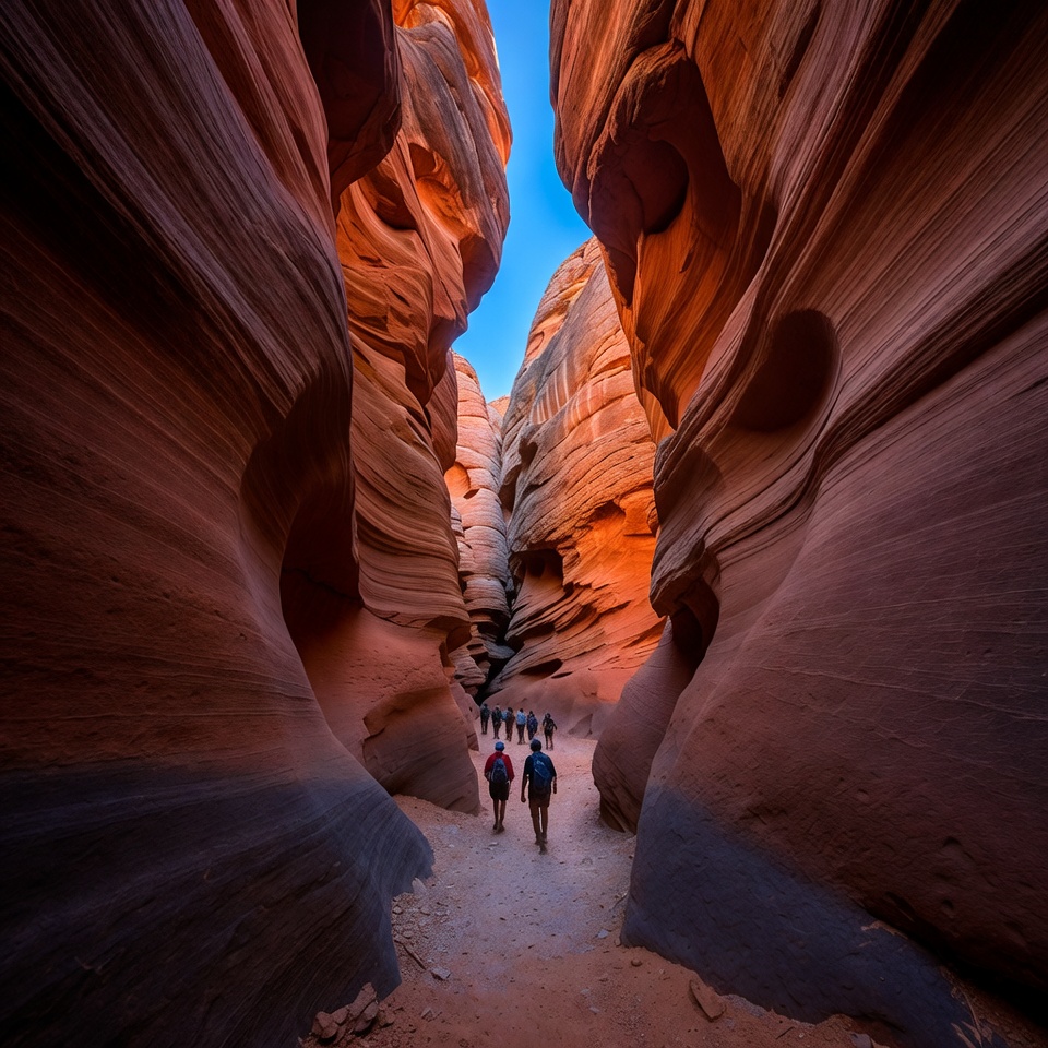A group of hikers walks along a narrow trail through towering red sandstone walls of a slot canyon. The vibrant orange rock formations curve dramatically under a clear blue sky. The scene captures the deep, sculpted narrowness of the canyon with distant figures emphasizing scale.
