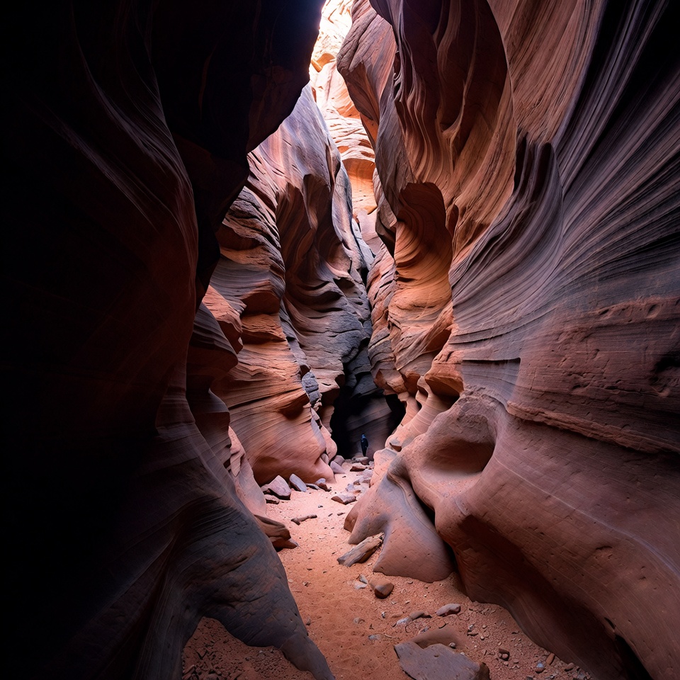 Southwest USA, Utah canyon, canyon walls, curved walls, desert canyon, dramatic lighting, geology, hiking trail, narrow canyon, narrow passage, natural light, red rock, rock formations, rocky ground, sand floor, sandstone walls, shadows, sunlight beam, wavy rocks, slot canyon