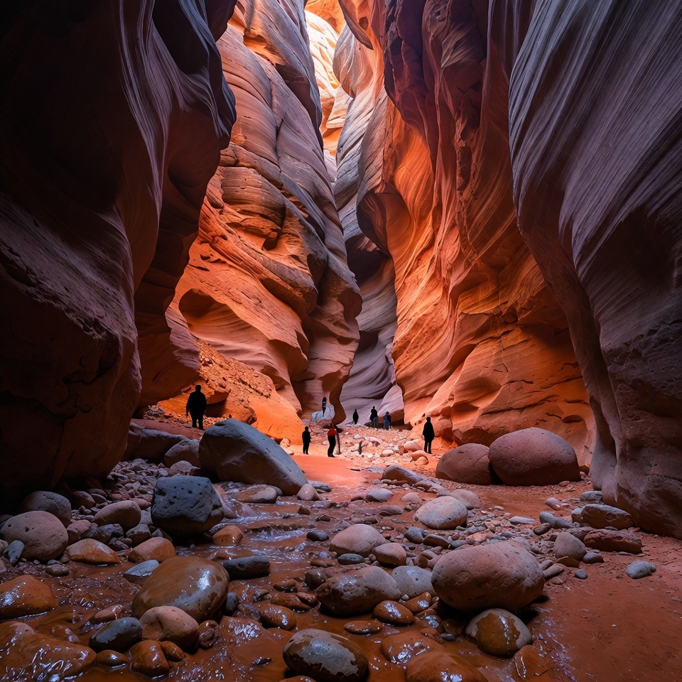 People hike through a narrow slot canyon with towering red sandstone walls and beams of sunlight illuminating the path. Large boulders and small streams of water scatter the canyon floor. Silhouetted figures in dark clothing walk along the rocky trail.