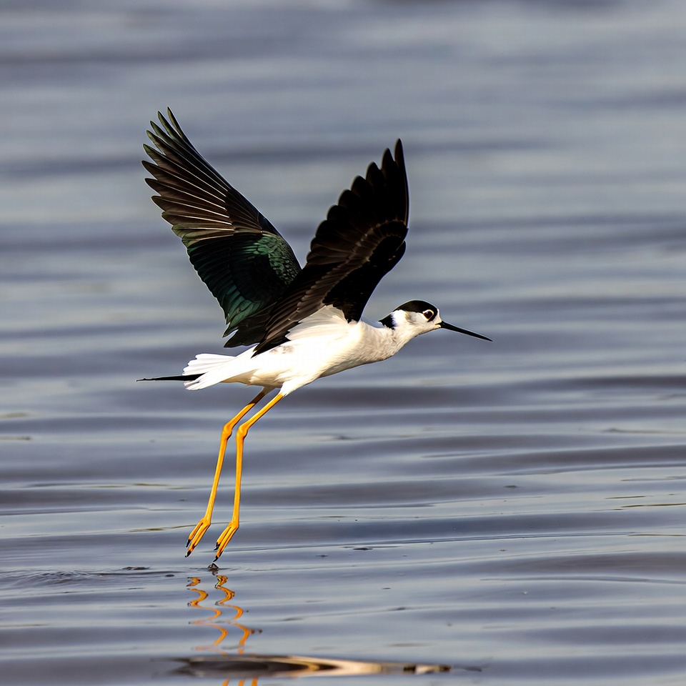 avian, bird flying, bird in flight, bird reflection, black head, black wings, calm water, feathers, flying bird, long bill, nature, orange legs, red legs, shorebird, stilt bird, wading bird, water, water bird, white body, wildlife, black-necked stilt