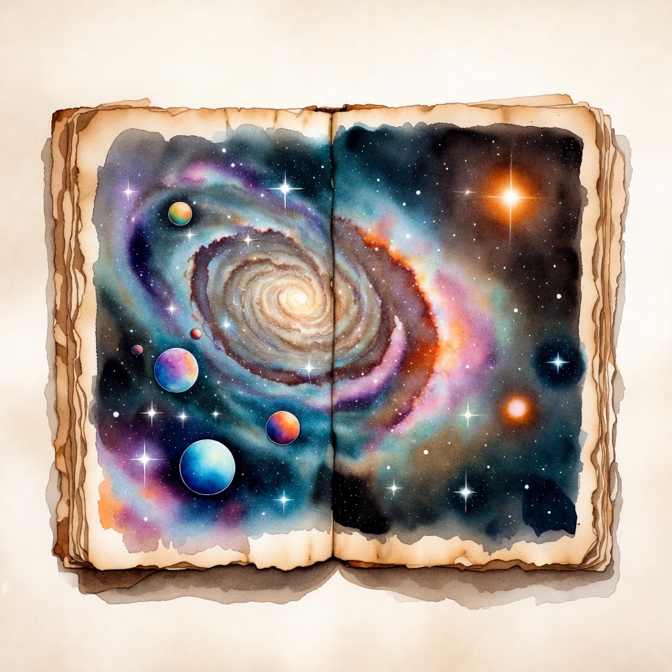 Milky Way, aged pages, antique book, astronomy, book art, colorful planets, cosmic book, cosmos, fantasy art, galaxy, illustration, isolated background, nebula, old book, planets, science fiction, space, spiral galaxy, starry sky, stars, sun, universe, watercolor, open book
