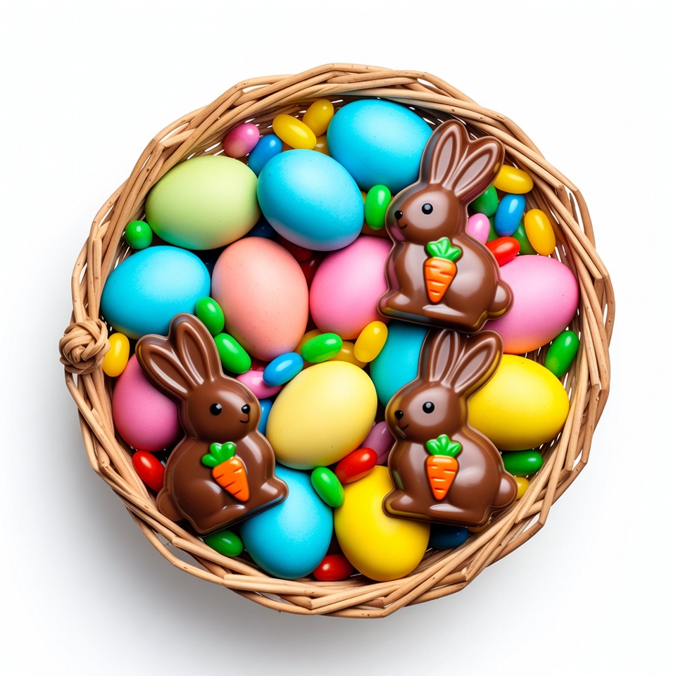 A woven basket overflows with colorful Easter eggs in shades of blue, pink, yellow, and green, along with jelly beans and chocolate bunnies holding carrots. The top-down view shows the vibrant assortment arranged neatly inside the basket on a white background. Several plastic and chocolate Easter bunnies are scattered among the eggs and candies.