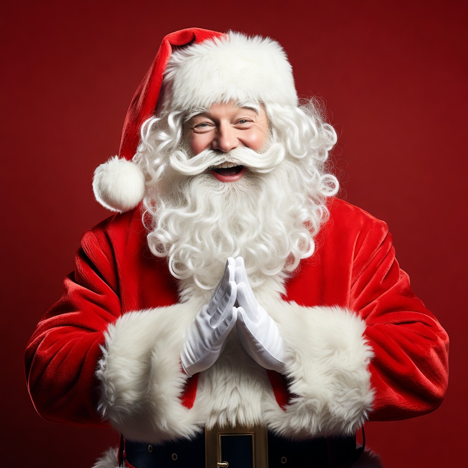 A cheerful Santa Claus with a white curly beard and long white hair wears a classic red Santa hat with white trim and pom-pom. He is dressed in a luxurious red velvet suit with white fur trim and black belt, standing against a solid red background. Santa smiles broadly with his hands clasped together in a praying gesture, wearing white gloves.