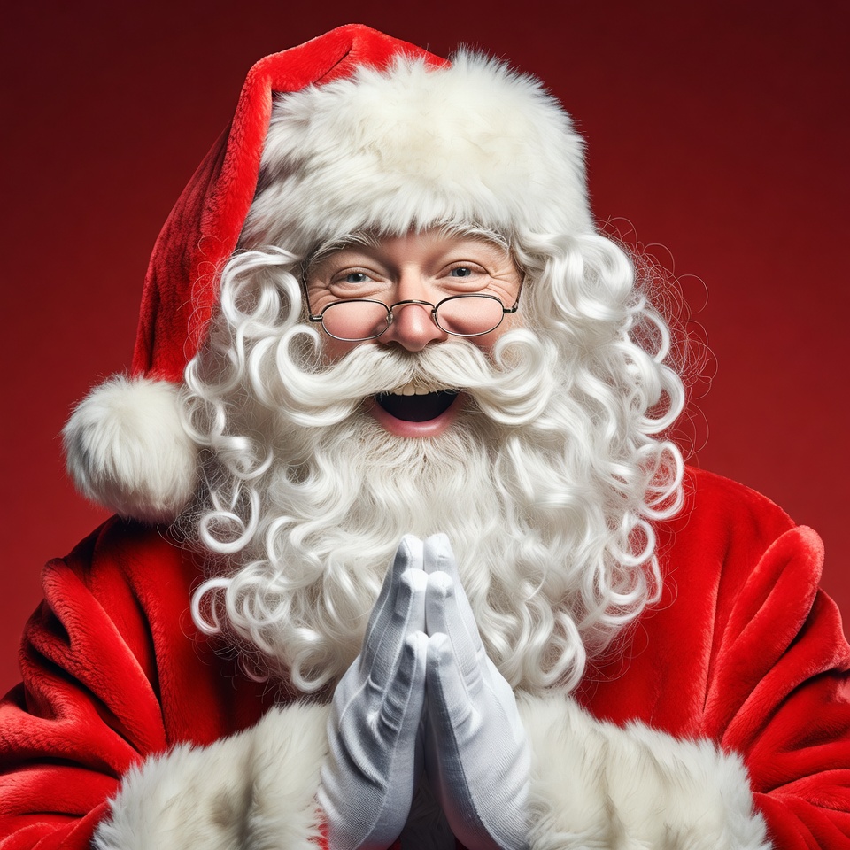 Christmas, Santa, Santa hat, White, cheerful, festive, fur trim, glasses, holiday, jolly, man, portrait, praying hands, red background, red suit, smiling, white beard, white gloves, white mustache, Santa Claus