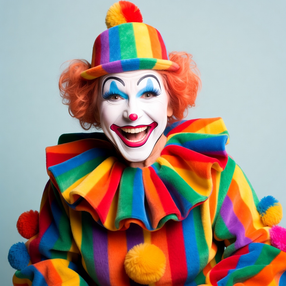 A clown with bright white face makeup, red nose, and exaggerated smile poses happily. She wears a rainbow-striped hat with yellow pom-pom, curly orange hair, and a multicolored ruffled collar and jumpsuit with pom-poms. The clown stands against a solid blue background.